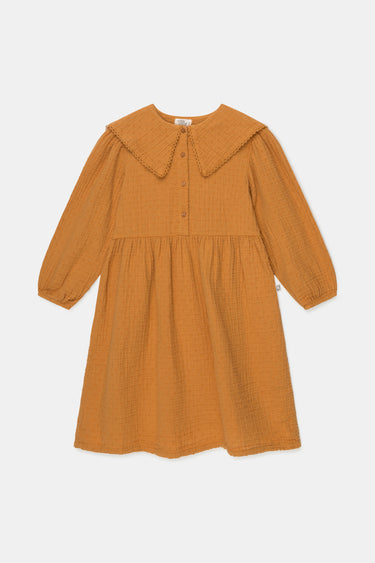 ¡Presentamos nuestro vestido texturizado hecho de algodón orgánico! Este conjunto de gasa presenta un hermoso cuello de babero y una tapeta frontal con botones para ponérselo fácilmente. Los puños elásticos hacen que sea cómodo para que tu pequeña se mueva. Con una costura fruncida en la parte superior, ofrece un volumen adicional que agrega un toque de estilo. Puedes estar segura de que la tela de este vestido de gasa para niña está certificada por GOTS y OEKO-TEX. Elige entre gris oscuro, mostaza, stone o rosa.