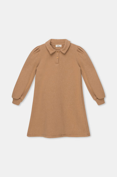 Este vestido tiene cuello vuelto, cierre de botones en la parte delantera, hombros abullonados, mangas largas, puños acanalados y dobladillo recto. Tejido de punto suave orgánico reciclado 58 % algodón reciclado, 38 % algodón orgánico, 4 % elastano. Disponible en gris claro, gris oscuro y camel.