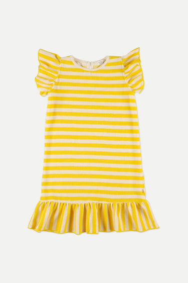 Vestido de rayas en tejido de toalla de algodón orgánico súper suave y cómodo. Escote redondo, cierre de ojal en la espalda y mangas con vuelo. Detalles de volantes en el dobladillo. Rayas en posición vertical en el dobladillo. 80 % algodón orgánico, 20 % poliéster reciclado. Tejido de punto