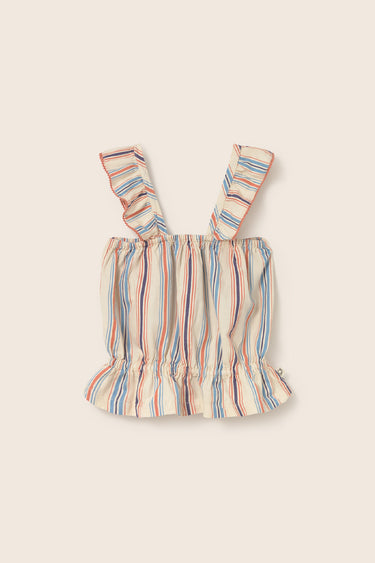 Top de rayas para niña en algodón suave y cómodo. Presenta tirantes ajustables que se anudan en la espalda con volantes y ribete de encaje en color contrastante, escote cuadrado y elástico en el pecho y la cintura para un ligero efecto abullonado.