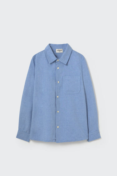Camisa para niño confeccionada en franela de algodón con un suave efecto jaspeado.  Presenta un cuello clásico, tapeta frontal con cierre de botones y un bolsillo parche en el pecho con el logo “Cozmo” bordado. Elaborada con 100% algodón sostenible.