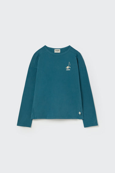 Esta camiseta forma parte de nuestra colección de ropa para niño de algodón orgánico , confeccionada en tejido jersey cálido. Presenta cuello redondo, hombros caídos y mangas largas. La parte delantera luce una nota musical estampada con "Cozmo" en el pecho, mientras que la espalda luce un pentagrama con notas musicales y el mensaje "Cozmo Playlist". Las inserciones triangulares en los laterales añaden un sutil detalle. El exterior cepillado ofrece una sensación suave y reconfortante.