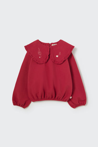 Esta sudadera para niña forma parte de la colección de algodón orgánico de Cozmo y está confeccionada en felpa perchada de alta calidad. Cuenta con un cuello bebé en tela texturizada con volante y detalles bordados musicales. Las mangas largas abullonadas con puños elásticos y el dobladillo elástico aseguran un ajuste cómodo. La apertura trasera con cierre en forma de gota facilita ponerla y quitarla. Por fuera es lisa y por dentro suave y cálida.