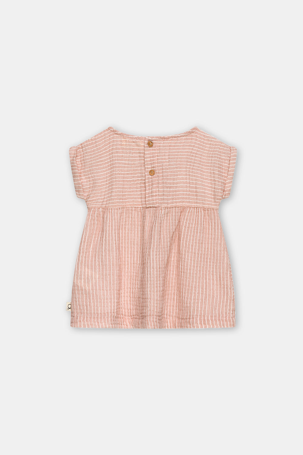 Este vestido de gasa orgánica a rayas tiene cuello redondo, mangas cortas, dos bolsillos de parche a los costados y cierre con botones en la parte posterior. Tiene frunces en el busto. Las rayas están cosidas horizontalmente en el busto y no verticalmente en la falda.