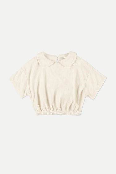 Top en tejido de toalla de algodón orgánico mullido y cómodo. Cuello Peter Pan y cierre de ojal en la espalda. Hombros caídos y mangas cortas. Dobladillo elastizado. Teñido en prenda. 85 % algodón orgánico, 15 % poliéster reciclado. Tejido de punto