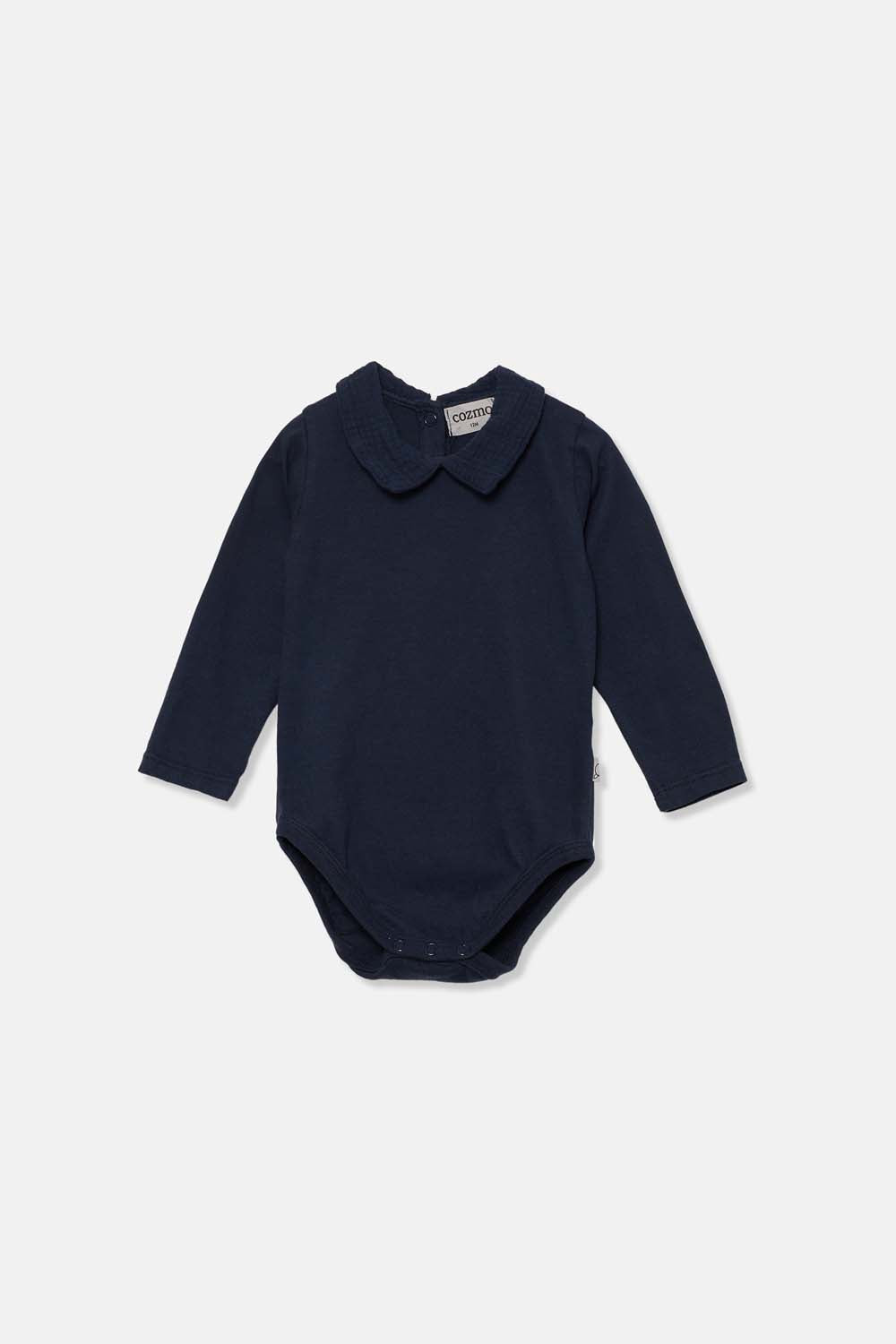 Cuello Peter Pan con tejido en contraste. Mangas largas. Botones a presión en la espalda y en el refuerzo. Aberturas de las piernas con canalé.