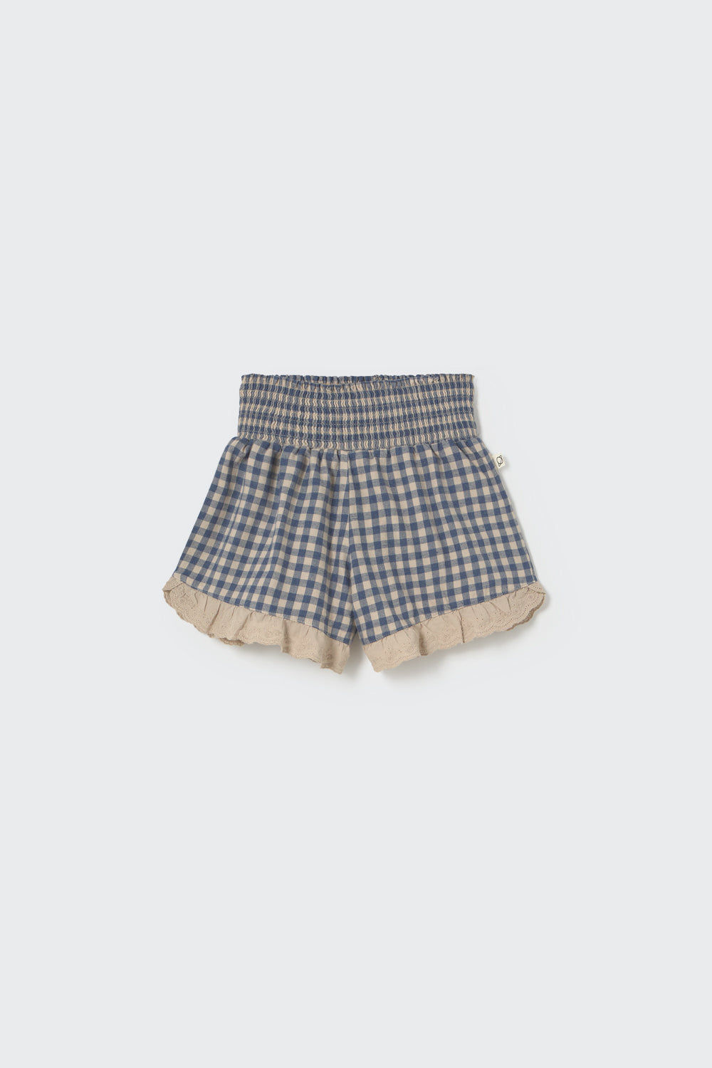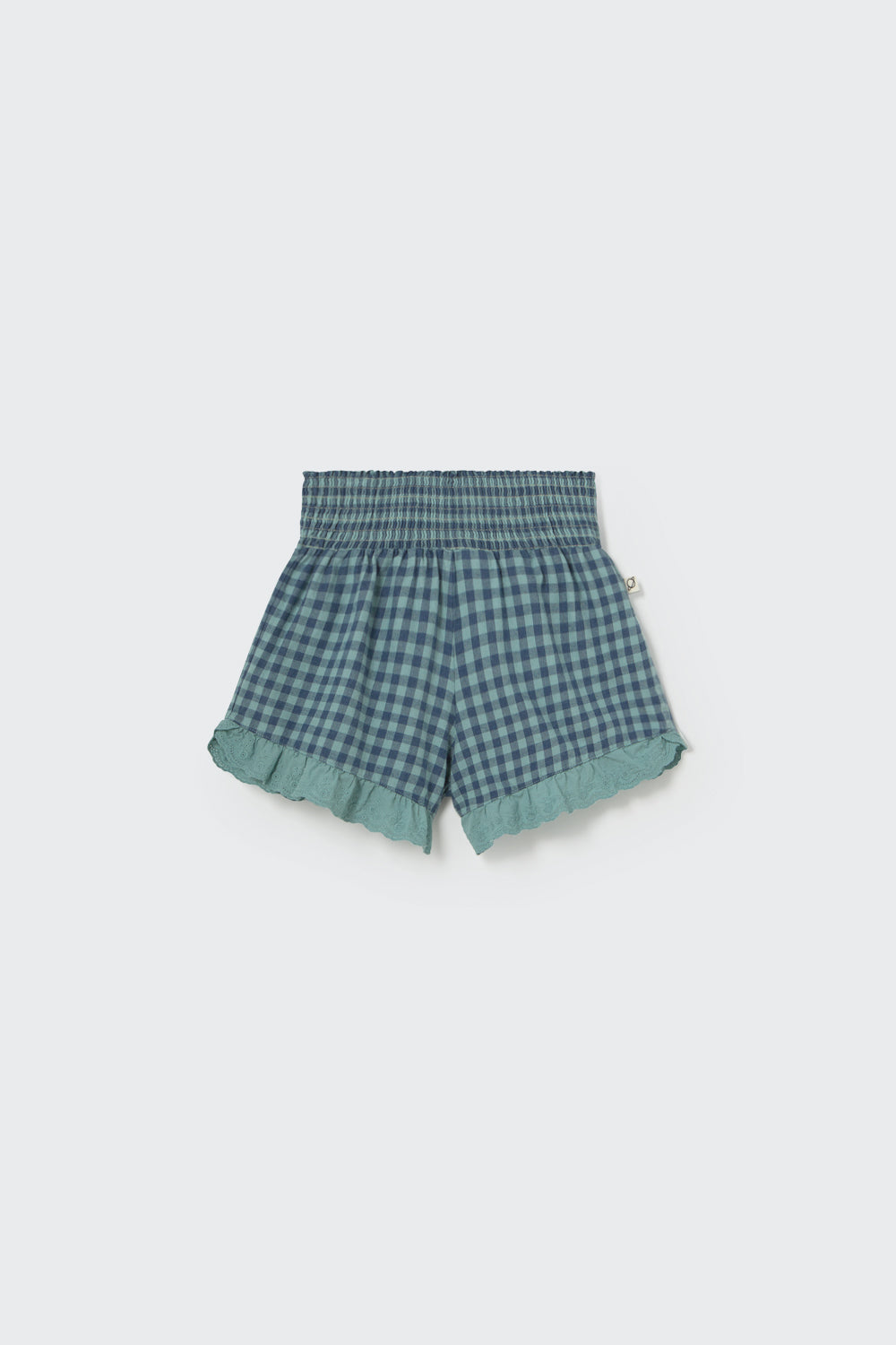 Pantalones cortos para niña confeccionados en franela perchada con un clásico estampado de cuadros vichy, elaborados en 100% algodón sostenible. Cuentan con una cintura ancha fruncida que garantiza un ajuste cómodo y detalles de volante con puntilla en contraste en los bajos. Suaves y cálidos al tacto.