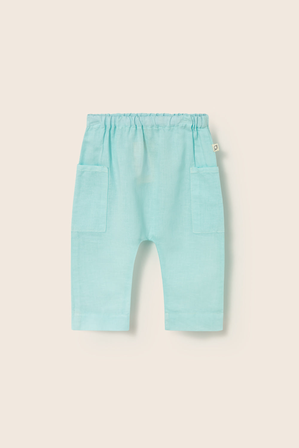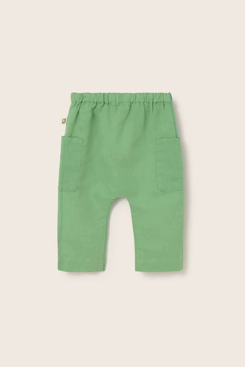 Baby pants made from a breathable cotton-linen blend. They feature an elastic, adjustable waistband, side patch pockets, and cuffed hems for a comfortable fit.