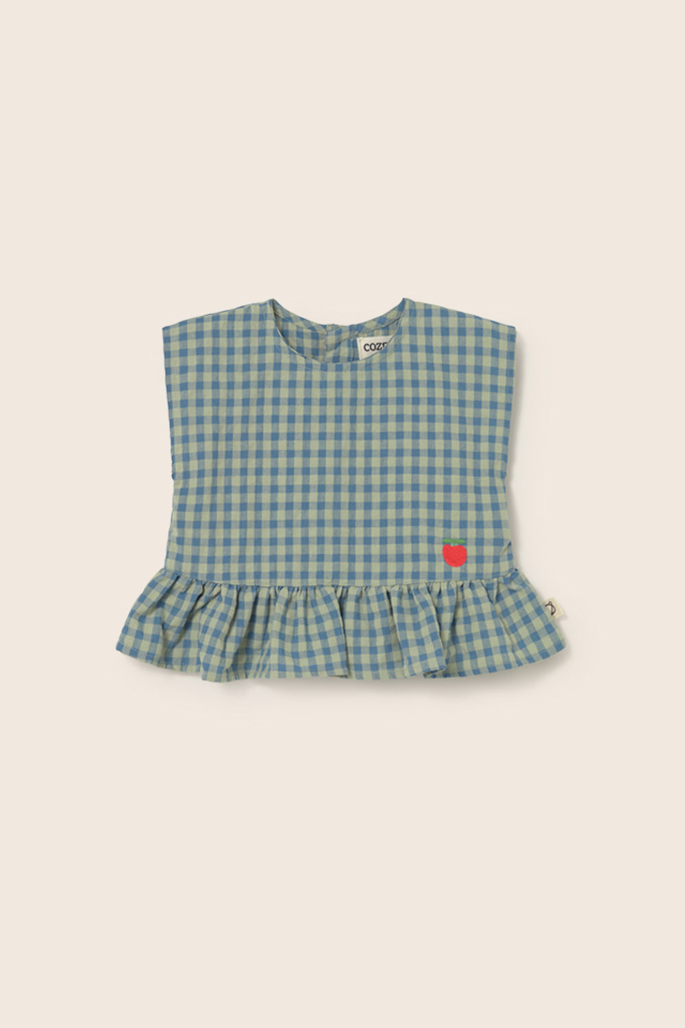 Baby girls’ cotton top in a fresh, lively gingham check pattern. It features a round neckline with buttons at the back, a sleeveless design, and a gathered ruffle trim at the hem. Finished with an embroidered apple detail at the front.