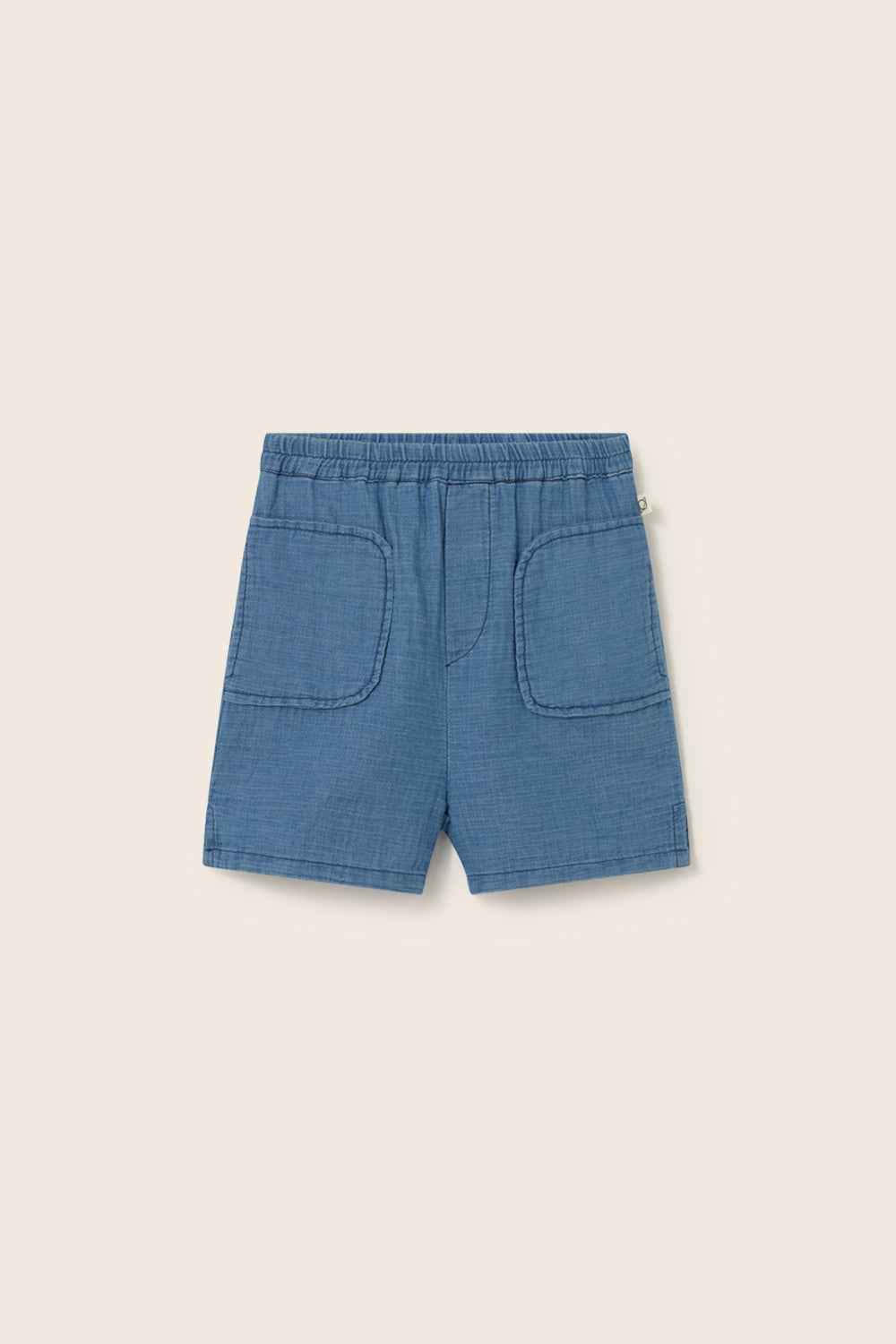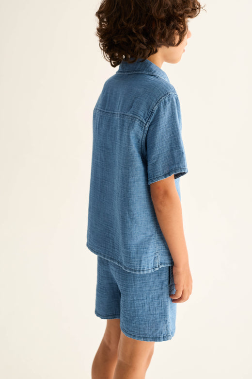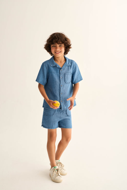 Boys’ shorts in textured cotton gauze with a denim-like finish. They feature an elastic waistband, rounded side patch pockets, a back yoke, and inset side slits for ease of movement and comfort.
