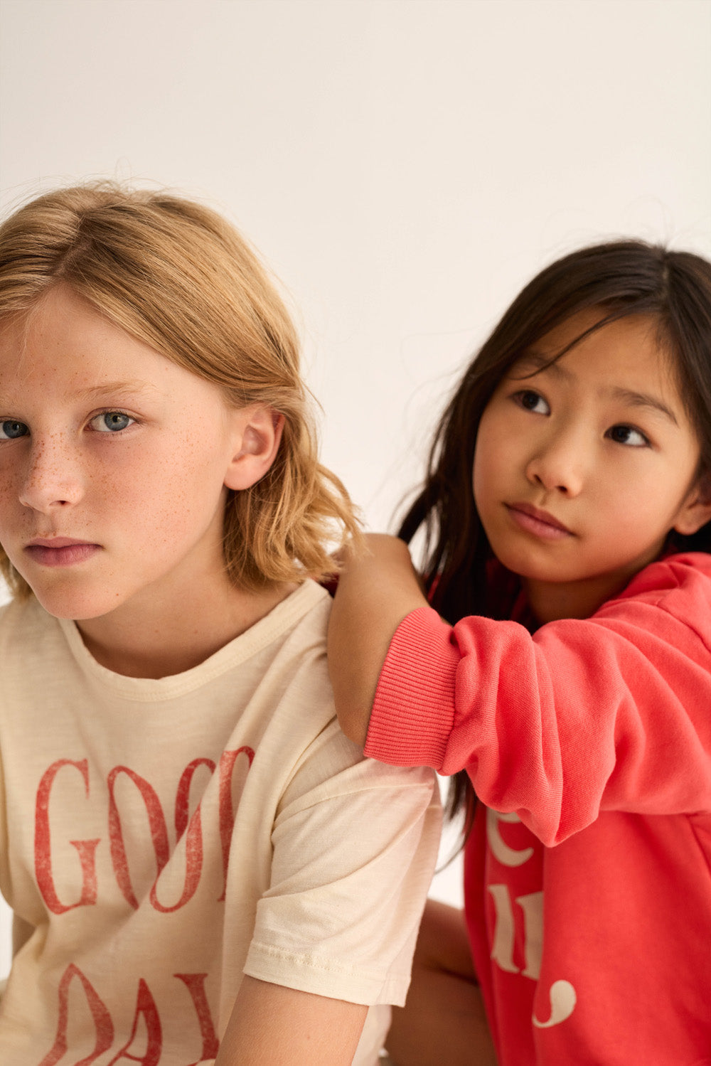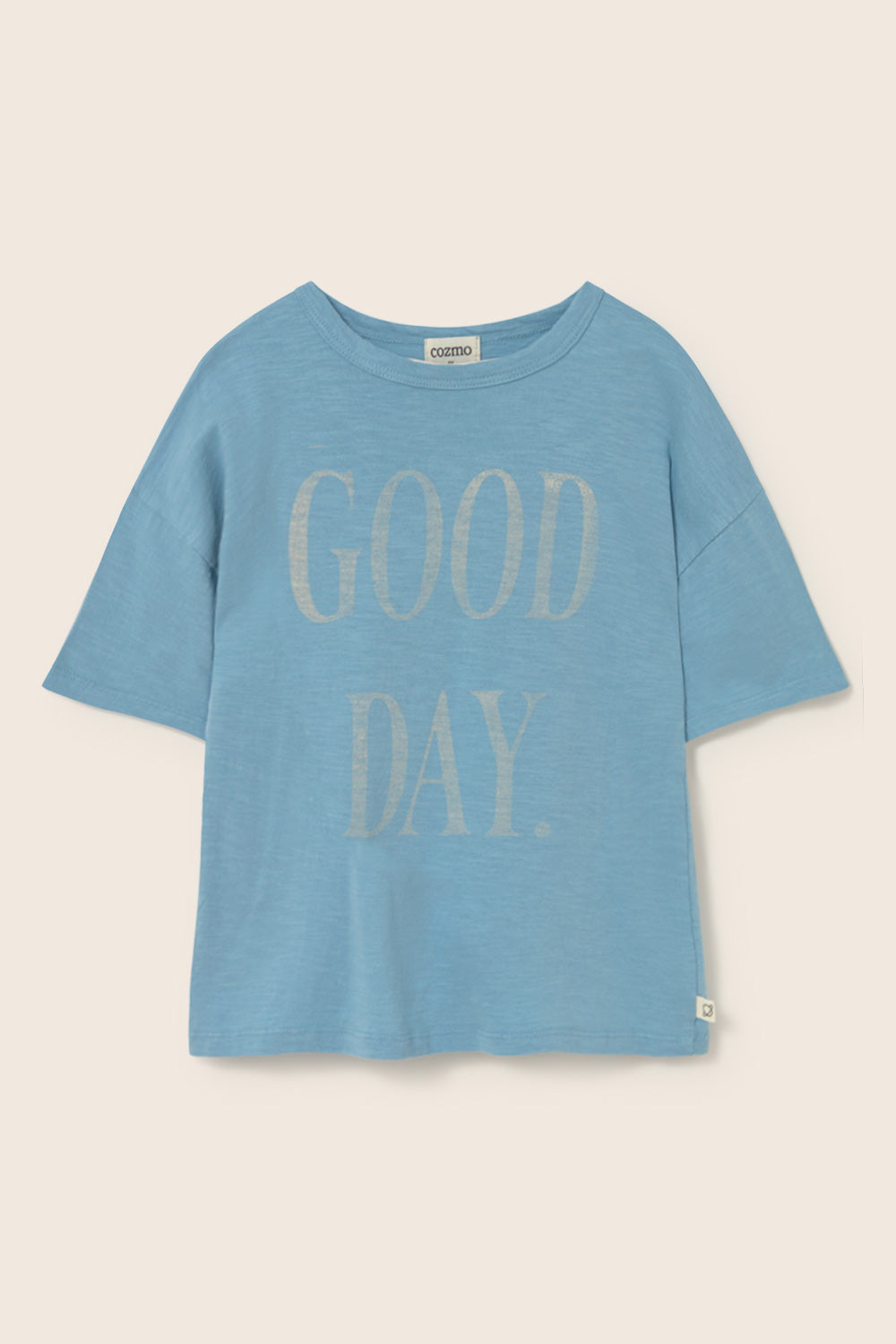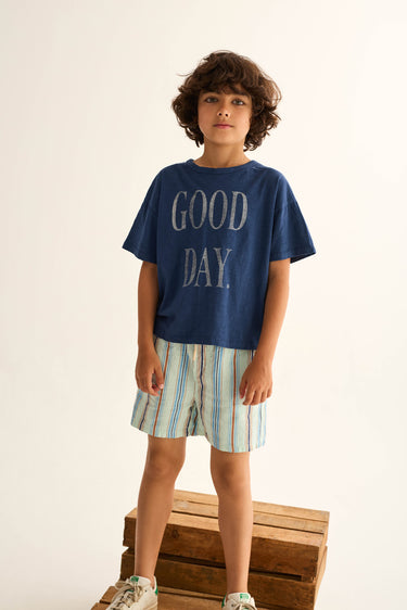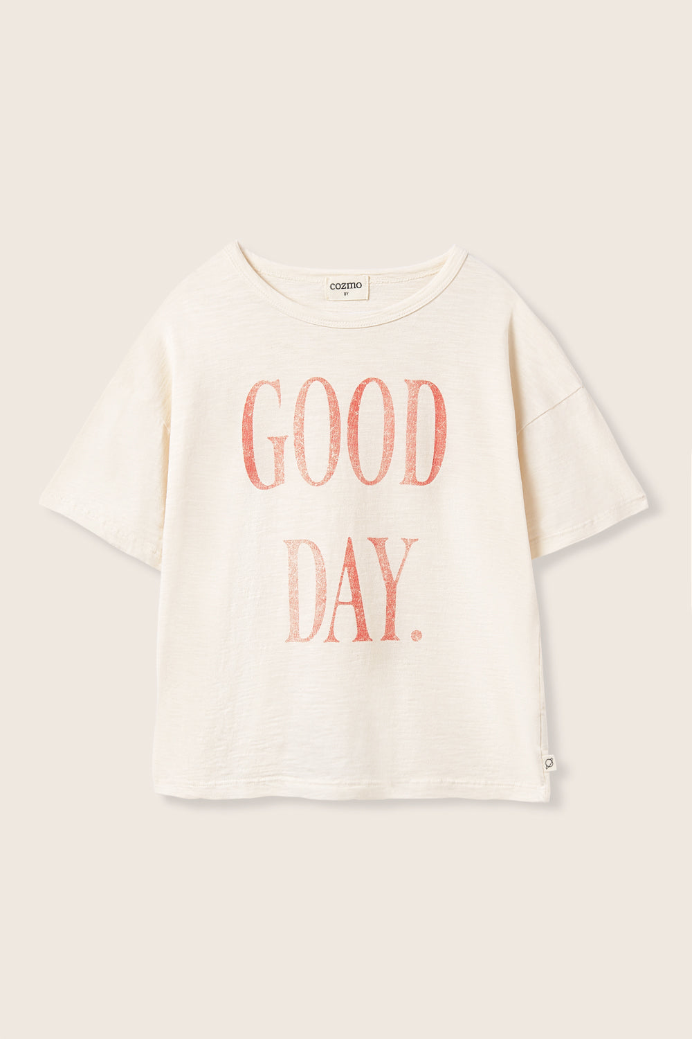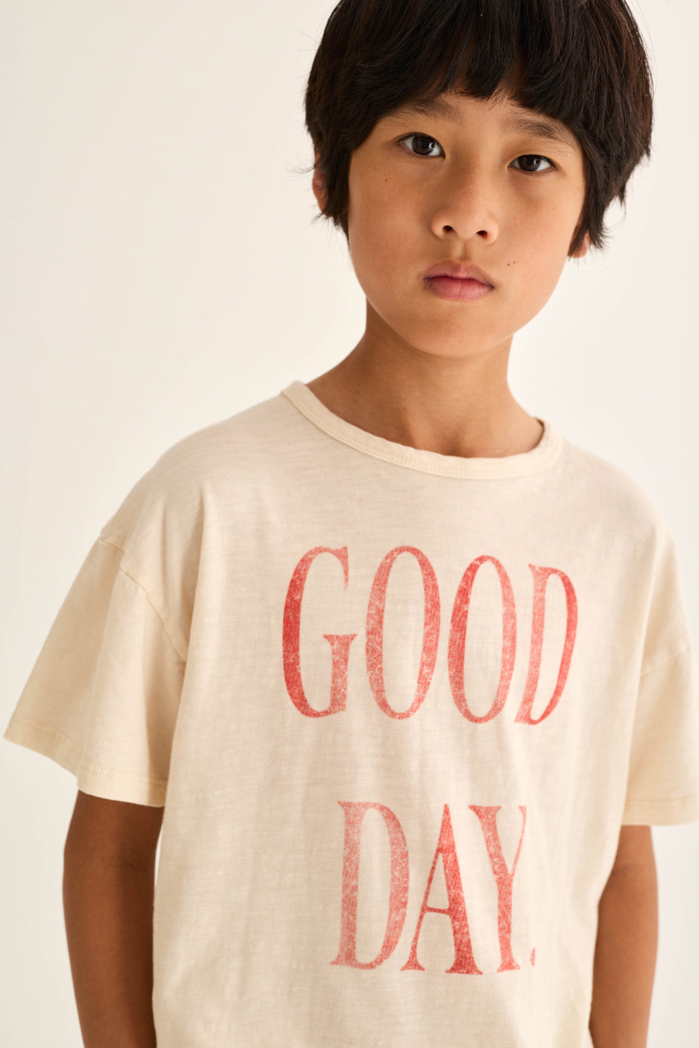 Boys’ T-shirt made from very lightweight slub cotton. It features a round neckline, dropped shoulders with short sleeves, and a printed motif with the message “good day”.