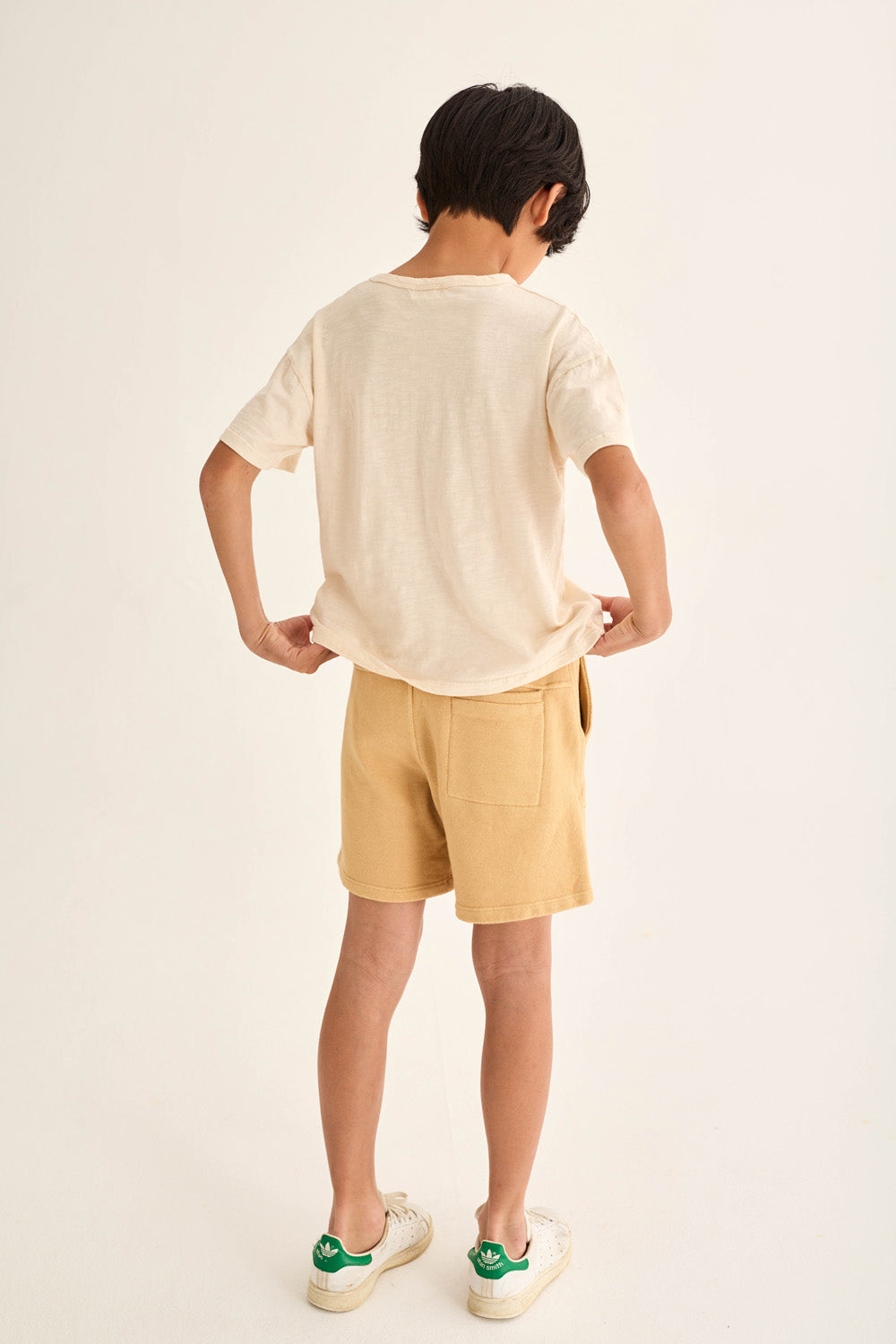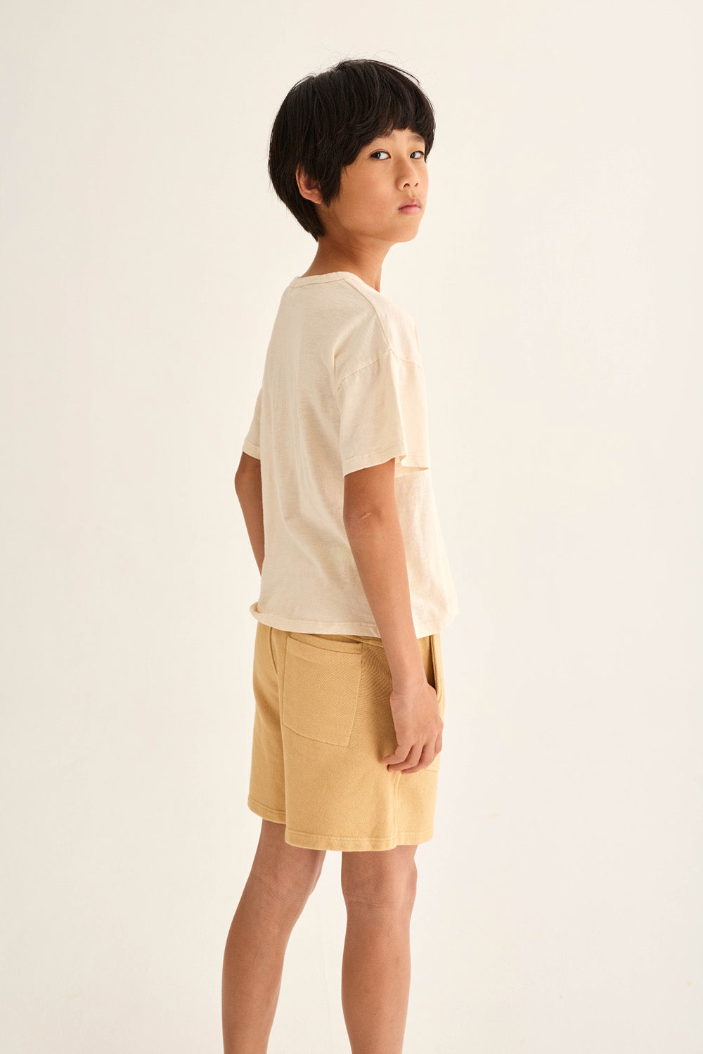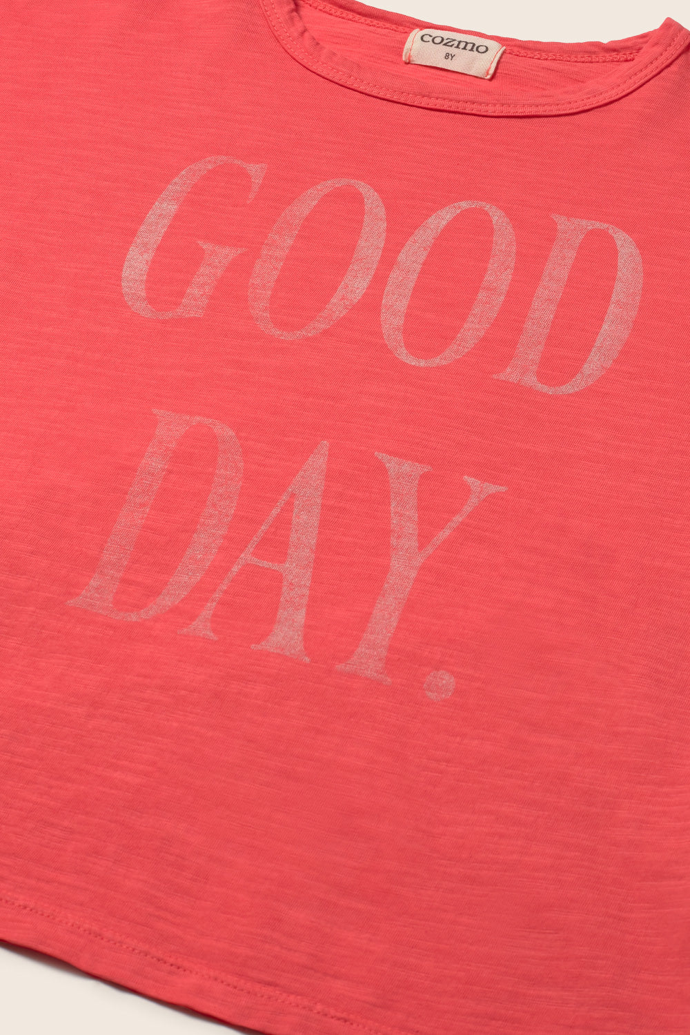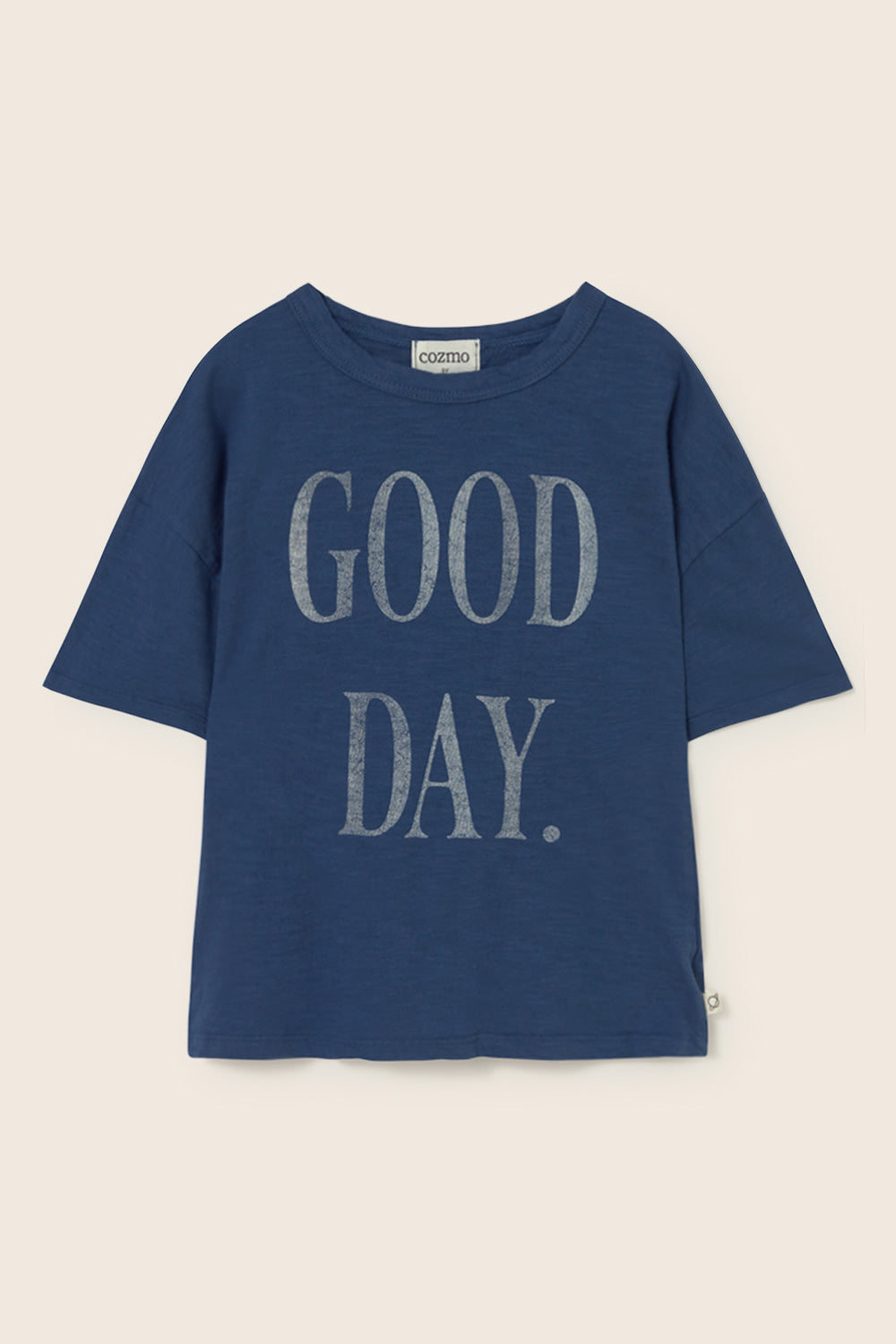 Boys’ T-shirt made from very lightweight slub cotton. It features a round neckline, dropped shoulders with short sleeves, and a printed motif with the message “good day”.
