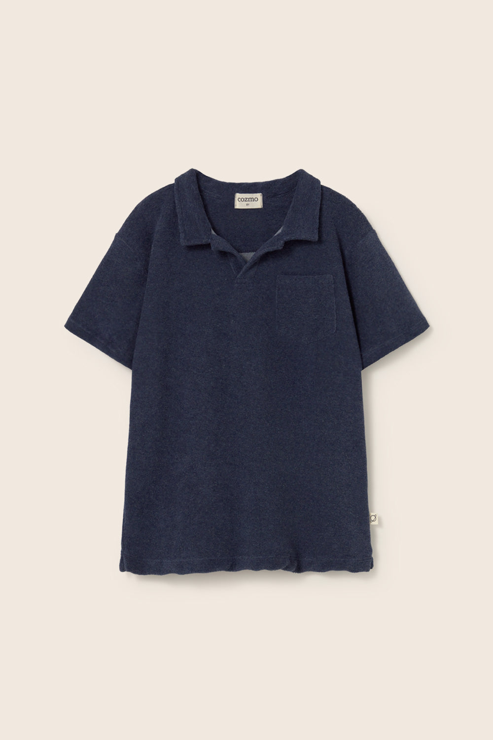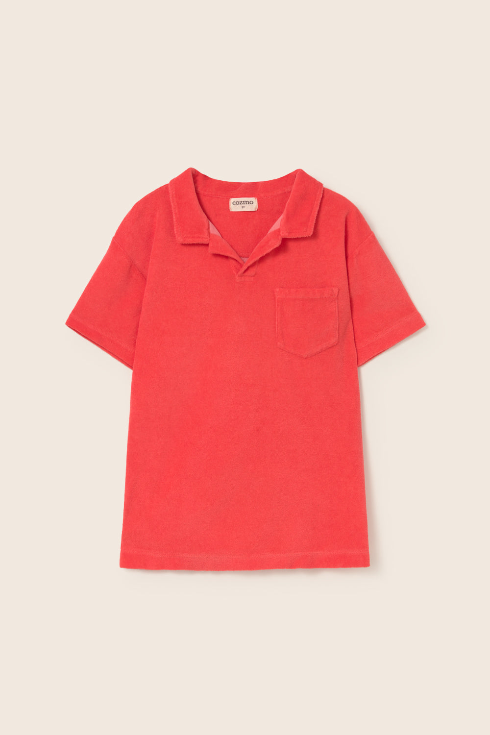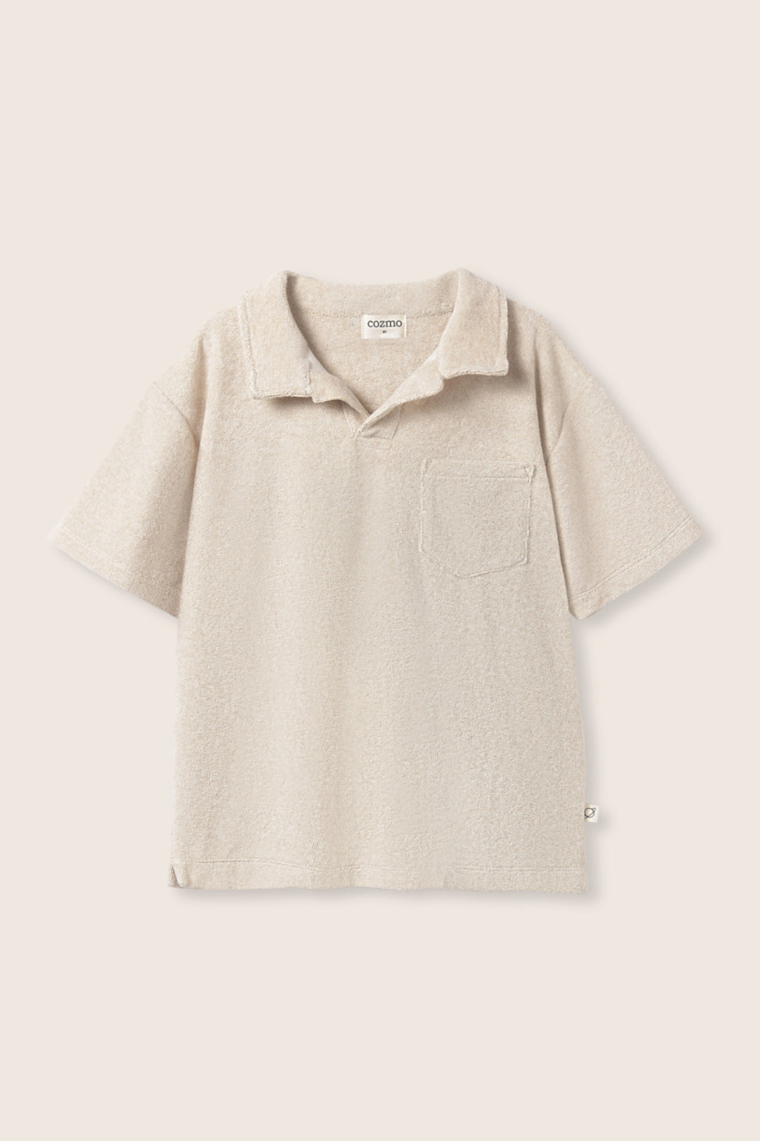 Boys’ polo T-shirt in soft terry cloth. It features an unbuttoned front, dropped shoulders with short sleeves, a chest patch pocket, side slits, and a rounded insert at the back of the neck for added comfort and detail.