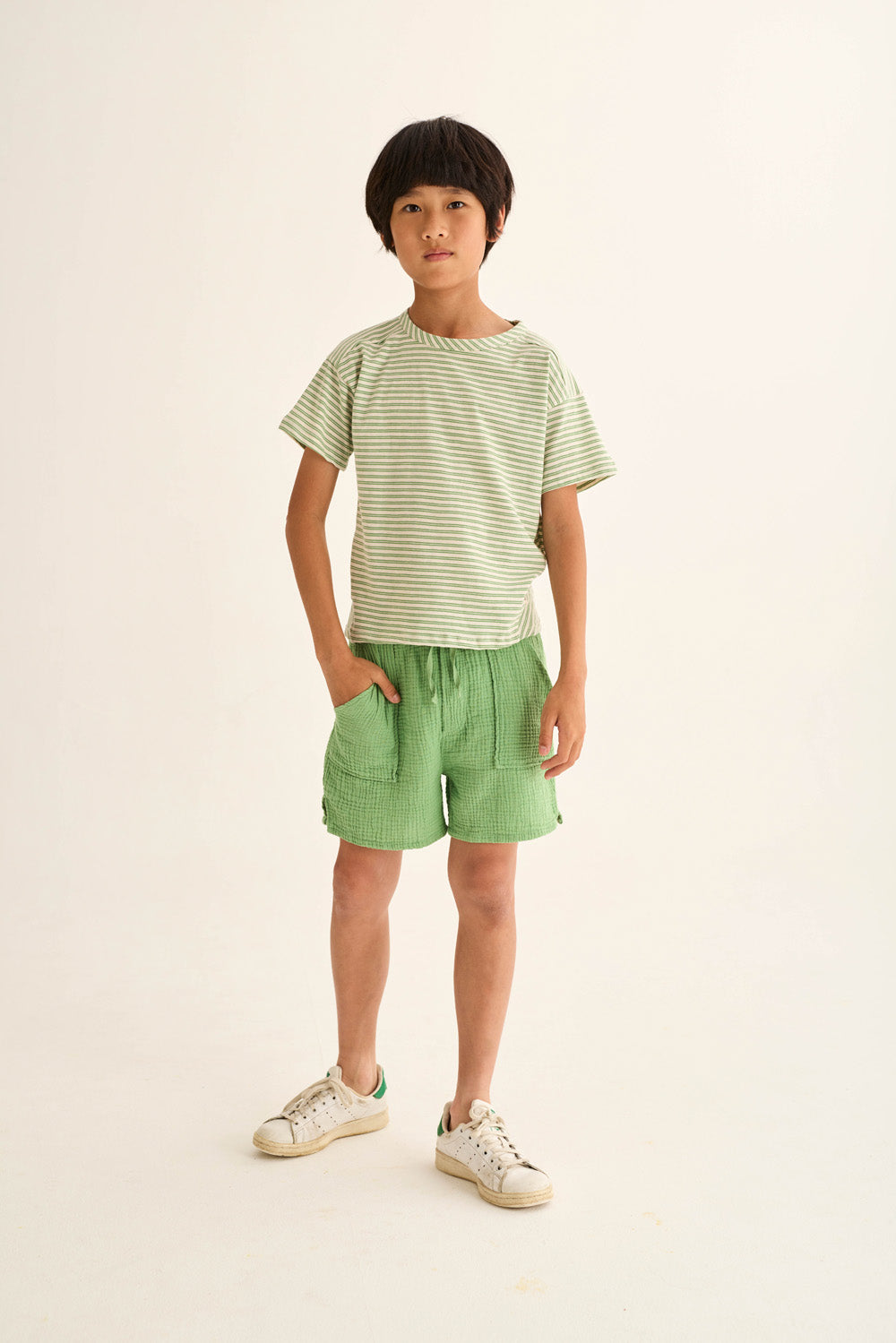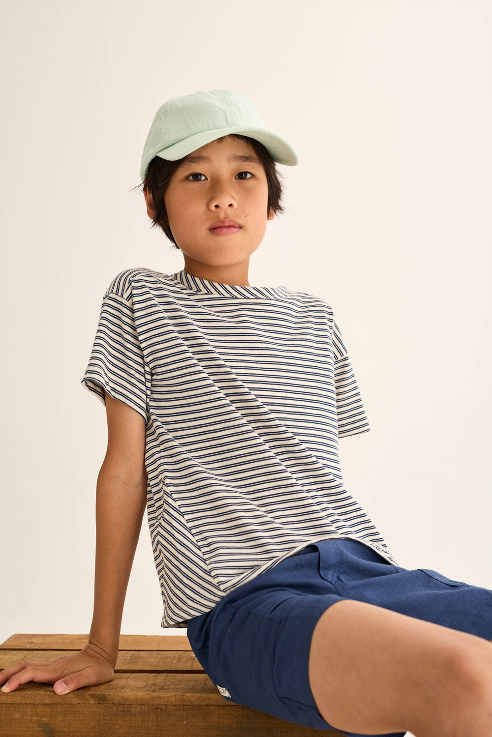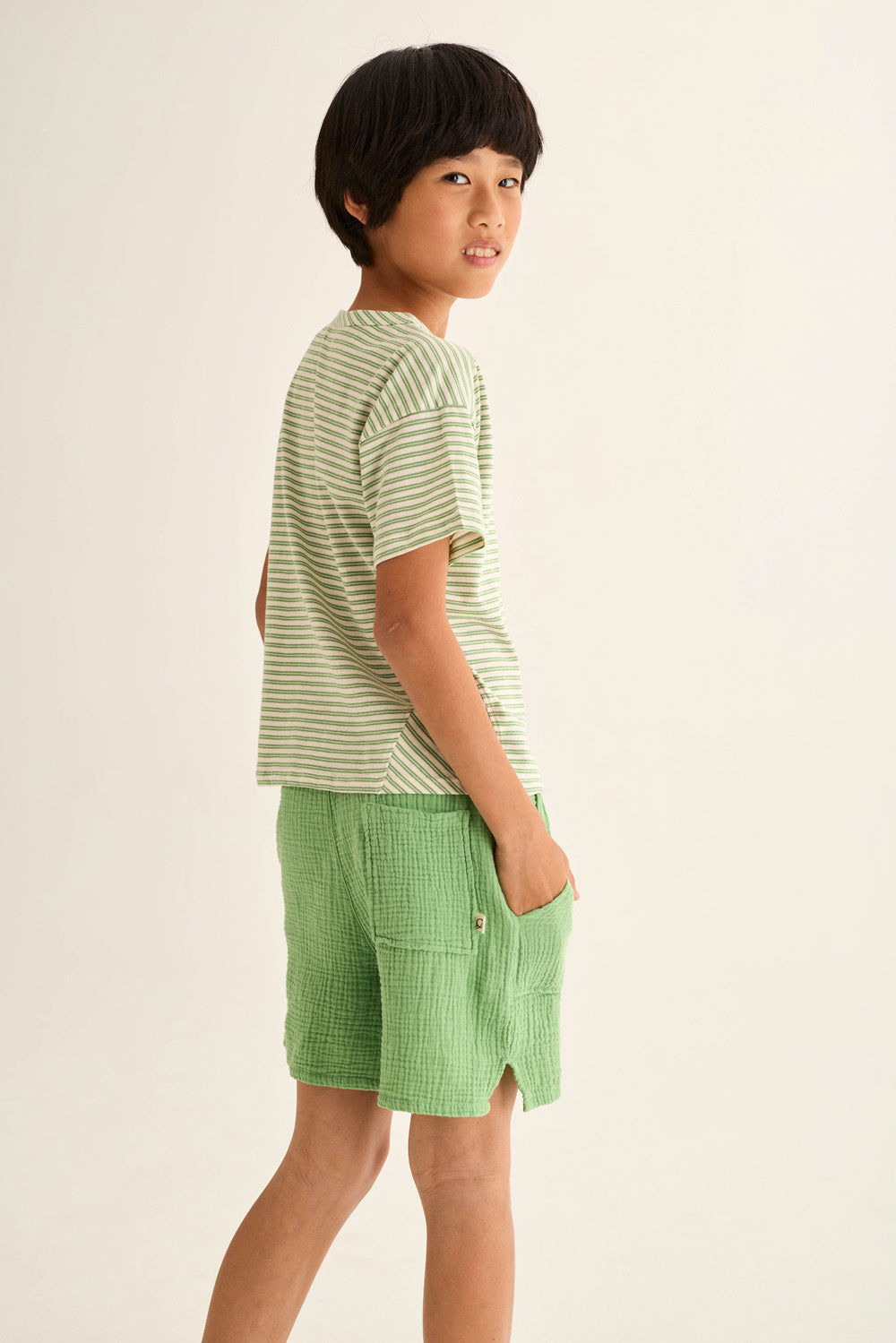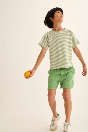 Boys’ striped T-shirt made from super breathable slub cotton. It features a round neckline, dropped shoulders with slightly forward seams, short sleeves, a chest patch pocket with diagonal stripes, and triangle inserts on the sides for a comfortable fit.