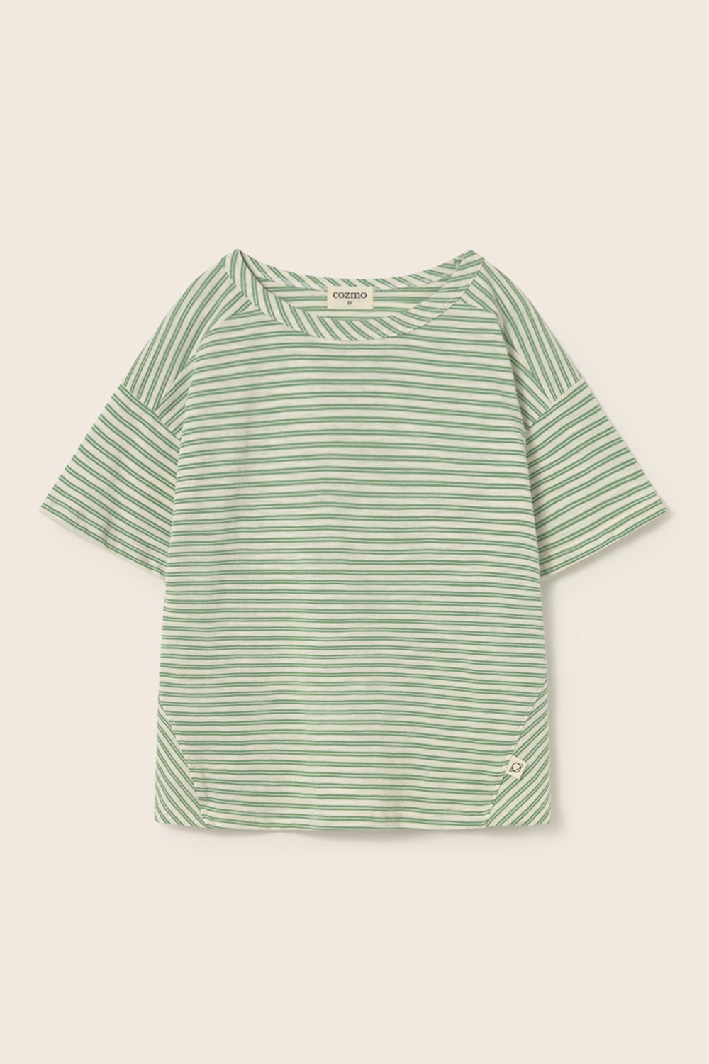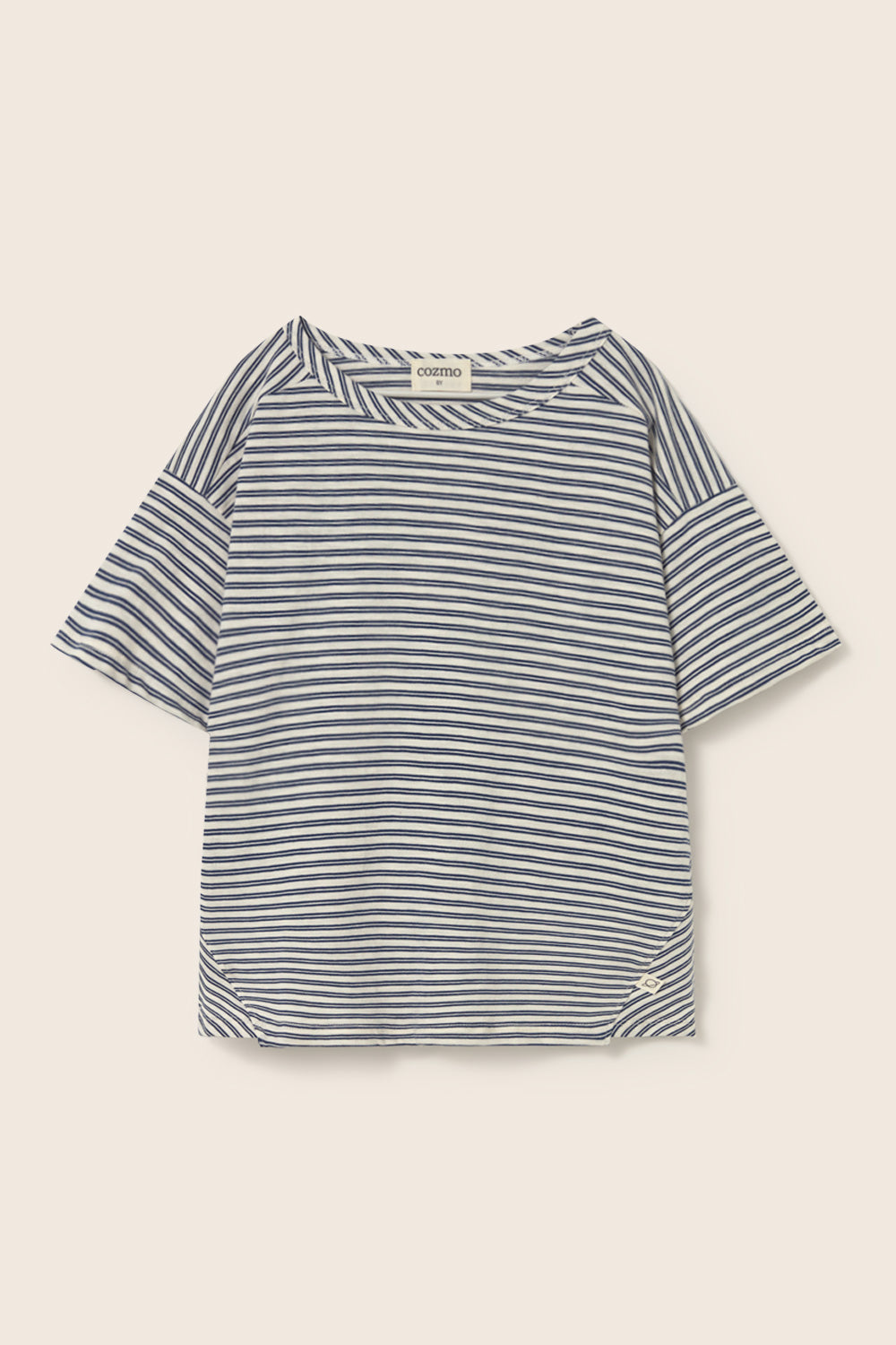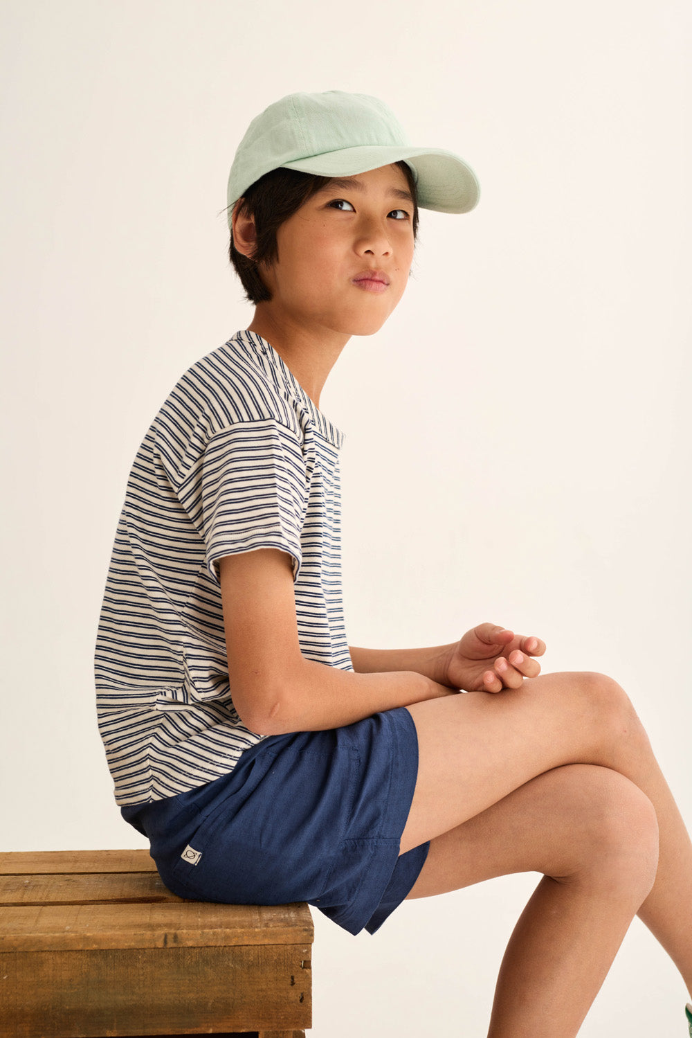 Boys’ striped T-shirt made from super breathable slub cotton. It features a round neckline, dropped shoulders with slightly forward seams, short sleeves, a chest patch pocket with diagonal stripes, and triangle inserts on the sides for a comfortable fit.