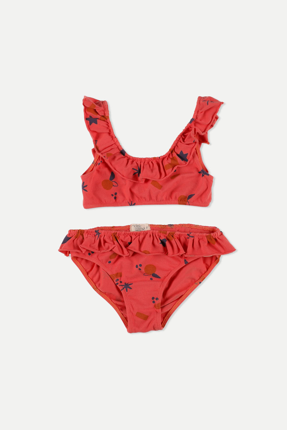 Bikini in lightweight and fast-drying cotton swim twill with a printed pattern. Top with a rounded neckline and ruffle trim at front extending over shoulder. Briefs with ruffle trim at waist. 92% cotton, 8% elasthane. Knit