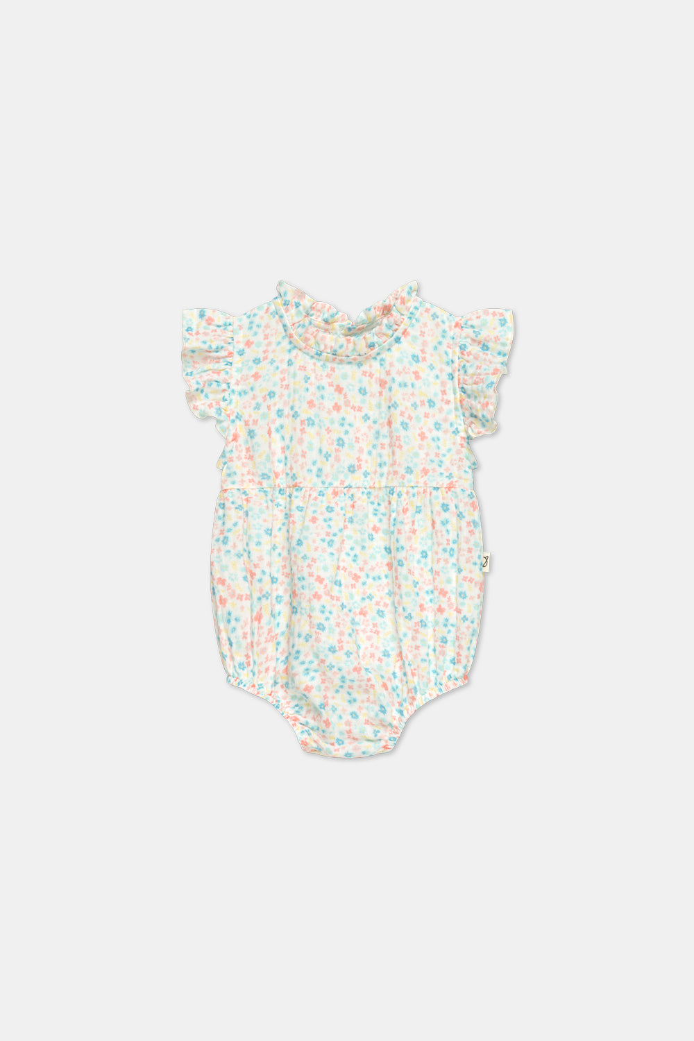 This organic gauze floral romper features a crew neck with ruffle details, flutter sleeves, and buttons at the back and the gusset. Gathered at the waist.