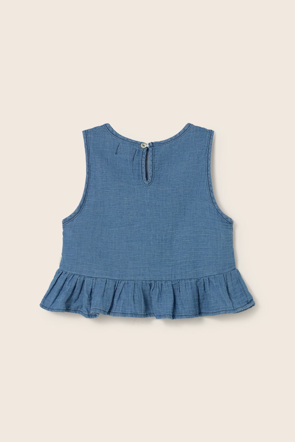 Girls’ sleeveless top in textured cotton gauze with a denim-like finish. It features a round neckline with a teardrop closure at the back and a flared peplum.