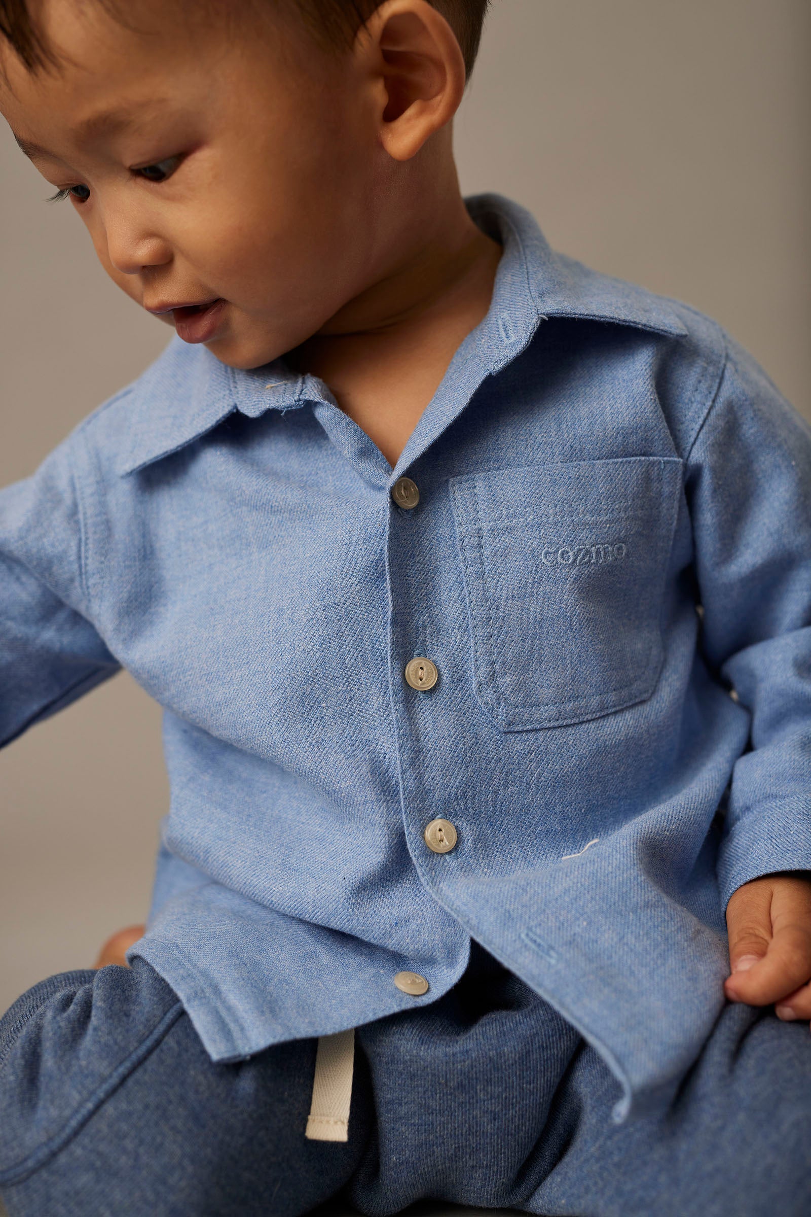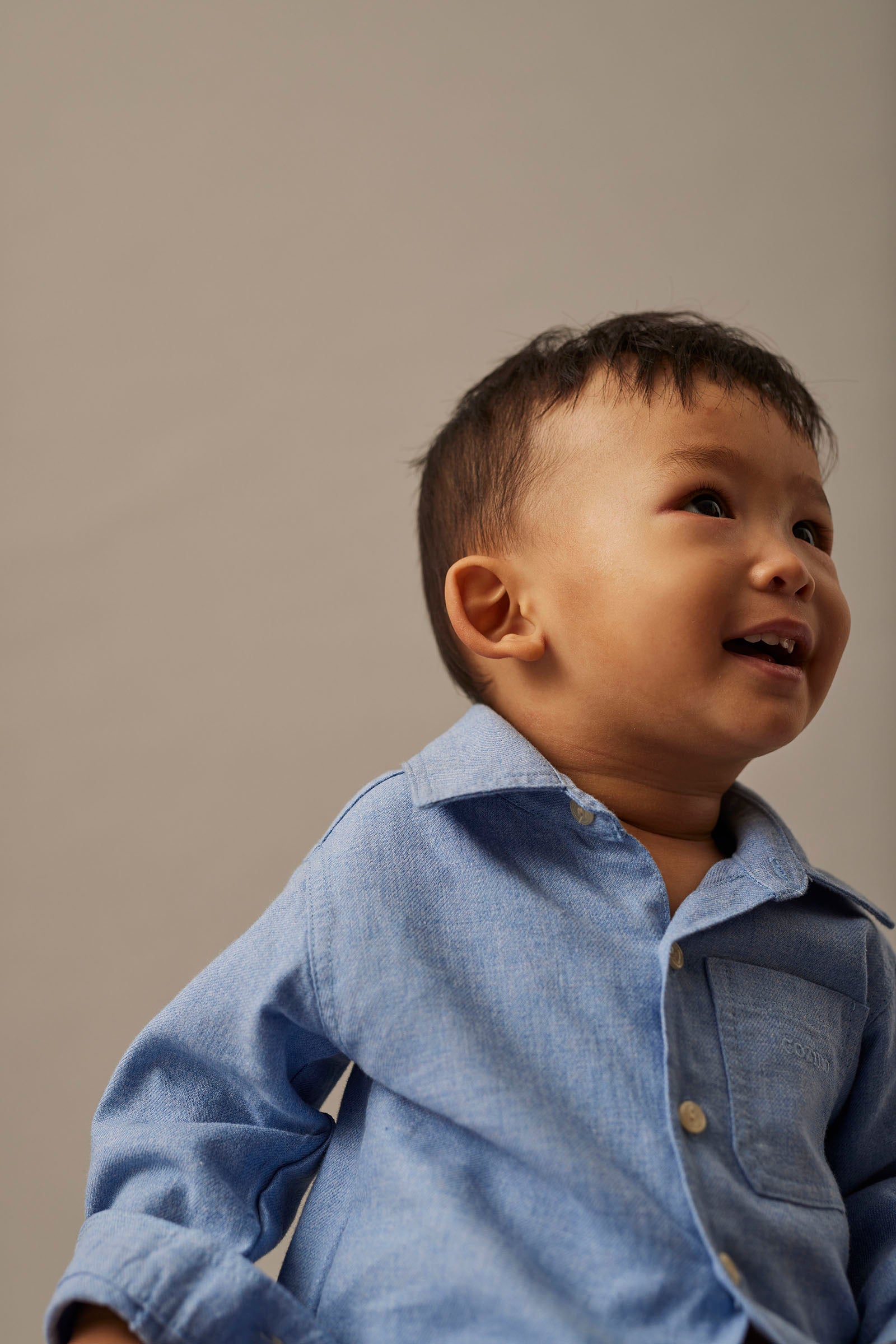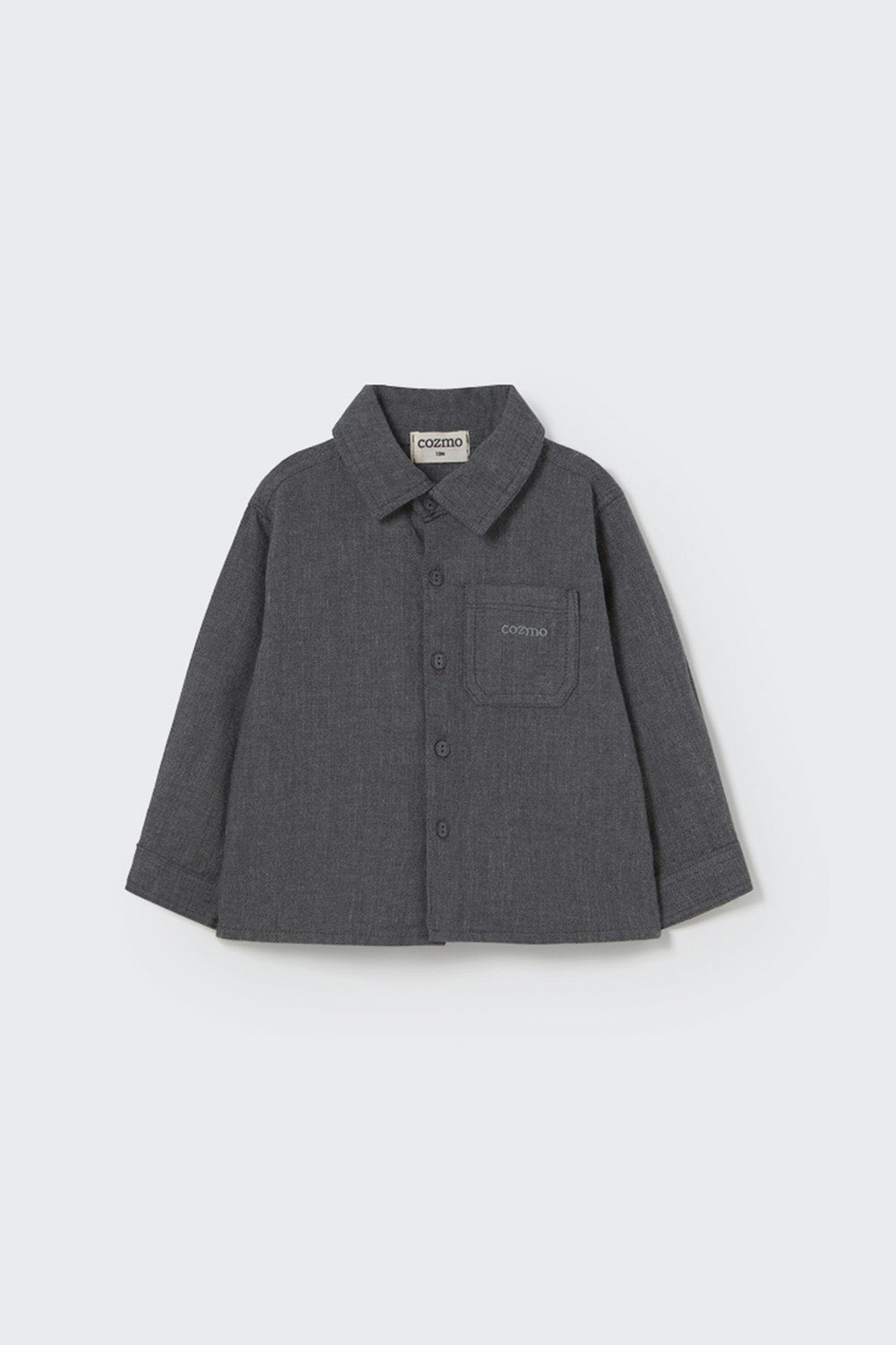 This baby boy shirt is made from cotton flannel with a mélange effect, crafted from 100% sustainable cotton. It features a classic collar, a button-down front placket, and a chest patch pocket with “Cozmo” embroidered on it. Buttoned cuffs offer a secure fit. Fully lined with a soft brushed knit for added warmth and comfort.