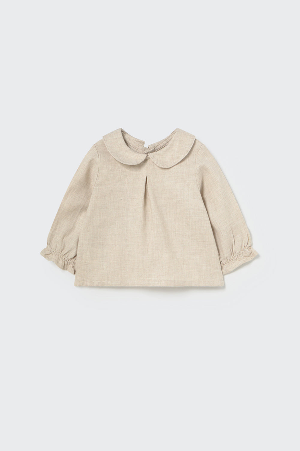 This newborn top is made from cotton flannel with a soft mélange effect, crafted from 100% sustainable cotton. It features a Peter Pan collar, front pleats, and a button closure at the back. The long sleeves have smocked cuffs finished with a ruffle trim for a comfortable fit.