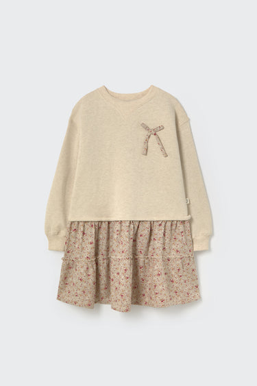 This girls’ dress is made from brushed fleece with mélange yarn, offering exceptional warmth and softness. It features a V-shaped collar, dropped shoulders, and long sleeves with ribbed collar and cuffs for a snug fit. A decorative bow on the chest adds charm. The layered overskirt and bow are crafted from flannel with a floral print, finished with a lettuce-edge trim for subtle detail. Made from 100% cotton, this dress keeps her cozy in cooler weather.