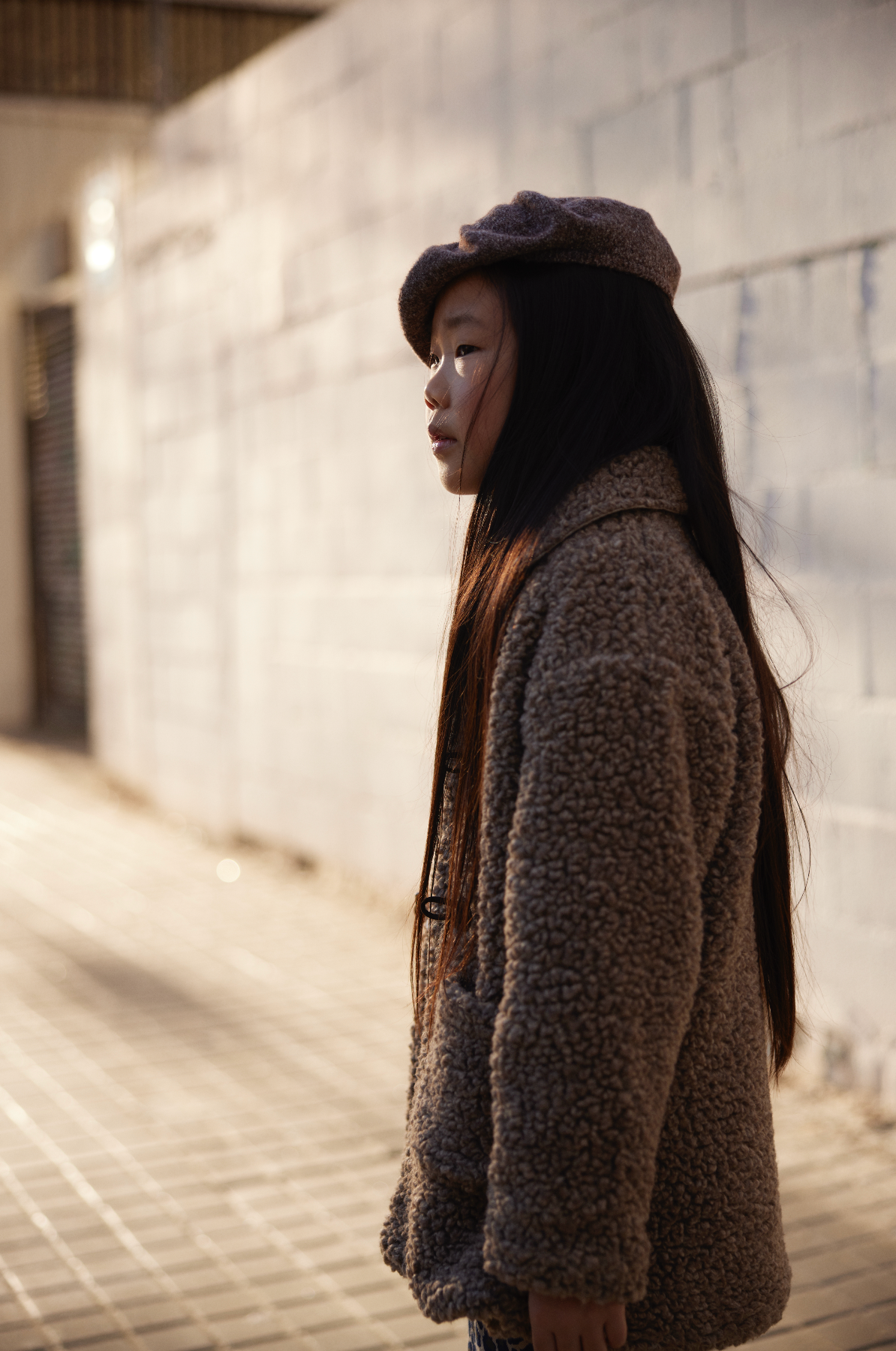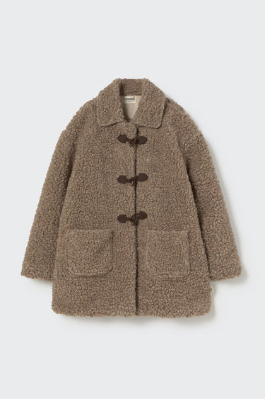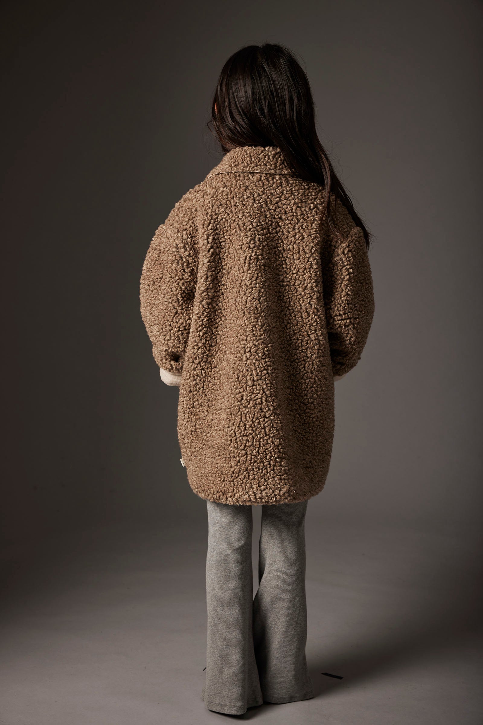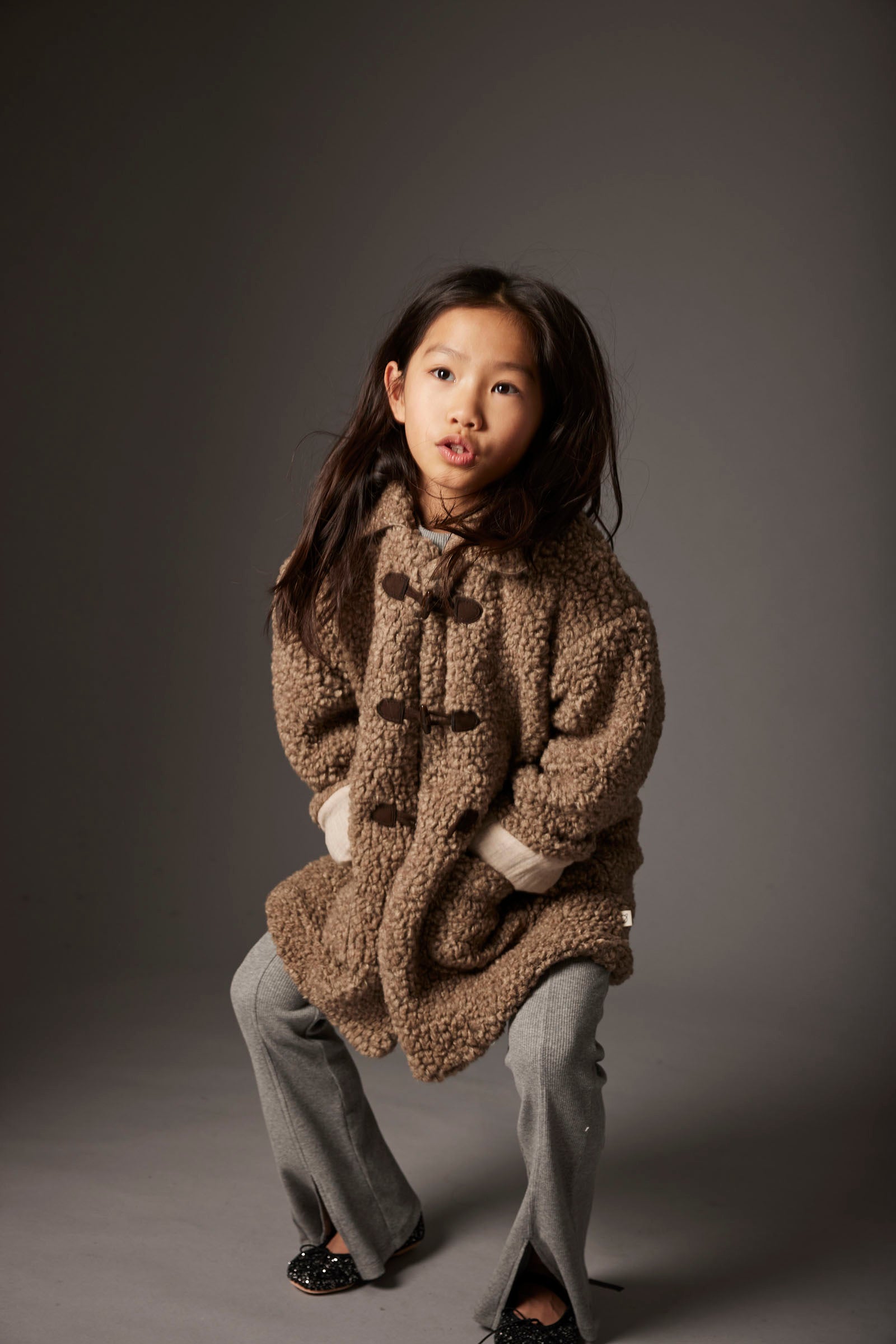 This kids’ coat is made from super warm sherpa knit virgin wool, offering a plush and cozy texture. It features a collar, toggle buttons, and two patch pockets. The back has a center seam for structure. With a mélange effect and full lining, this coat provides extra warmth and comfort.