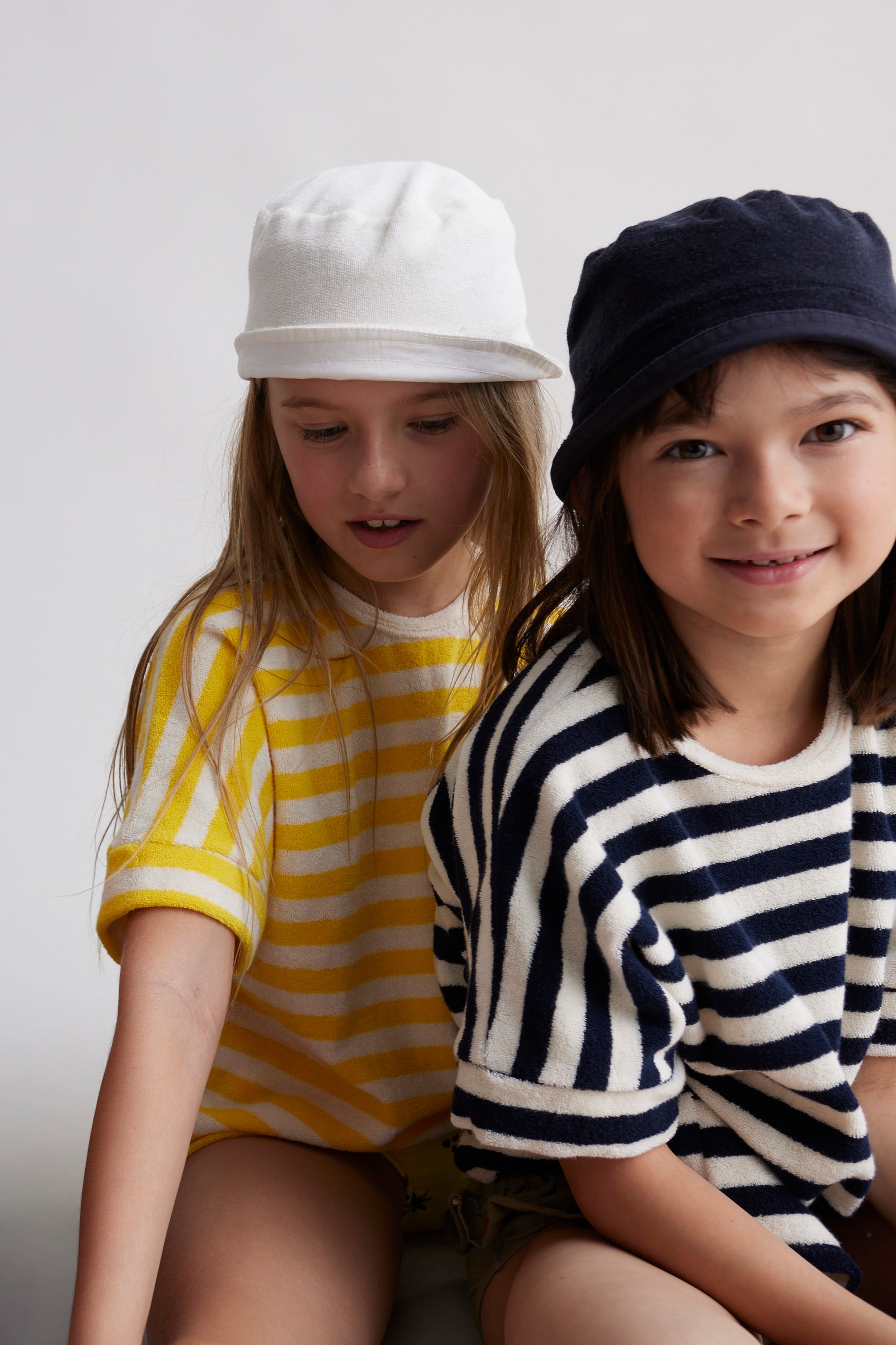 Bucket hat in a fluffy, comfy, organic cotton towel fabric. Lined. Garment dyed. 85% organic cotton, 15% recycled polyester. Knit
