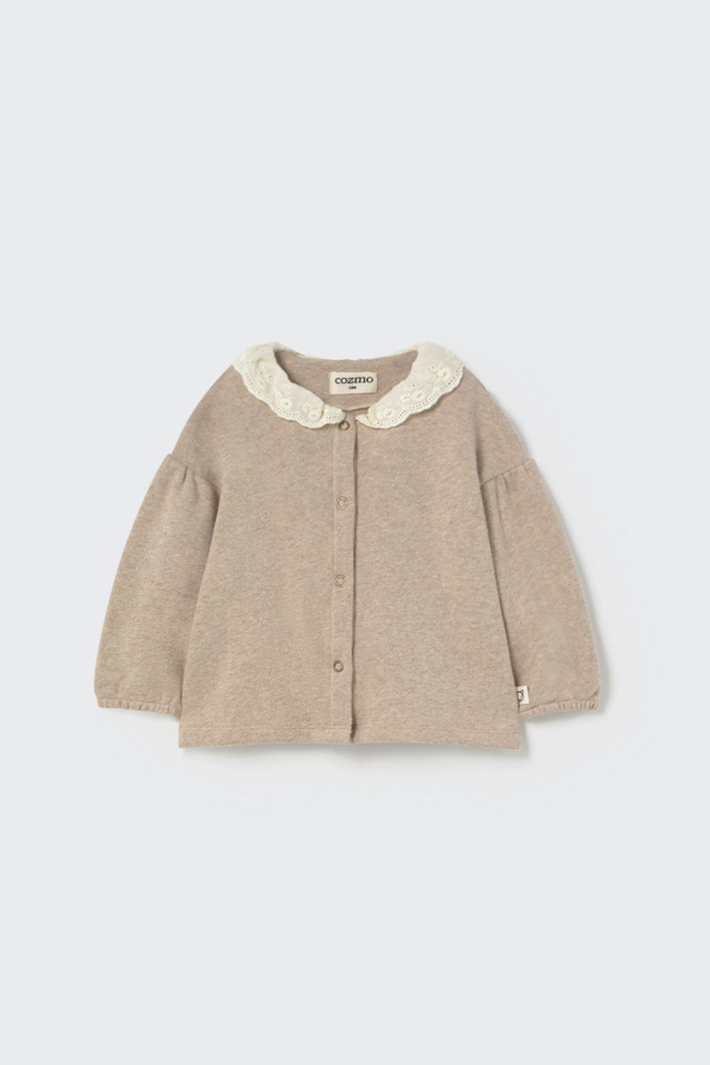 This baby cardigan sweater is crafted from a buttery-soft knit, brushed both inside and out for a toasty, extra warm feel. It features a scalloped collar with delicate lace detailing and a button-down placket at the front. Long puffed sleeves with elastic cuffs provide a gentle fit, making this piece as cozy as it is practical—perfect for cooler days.