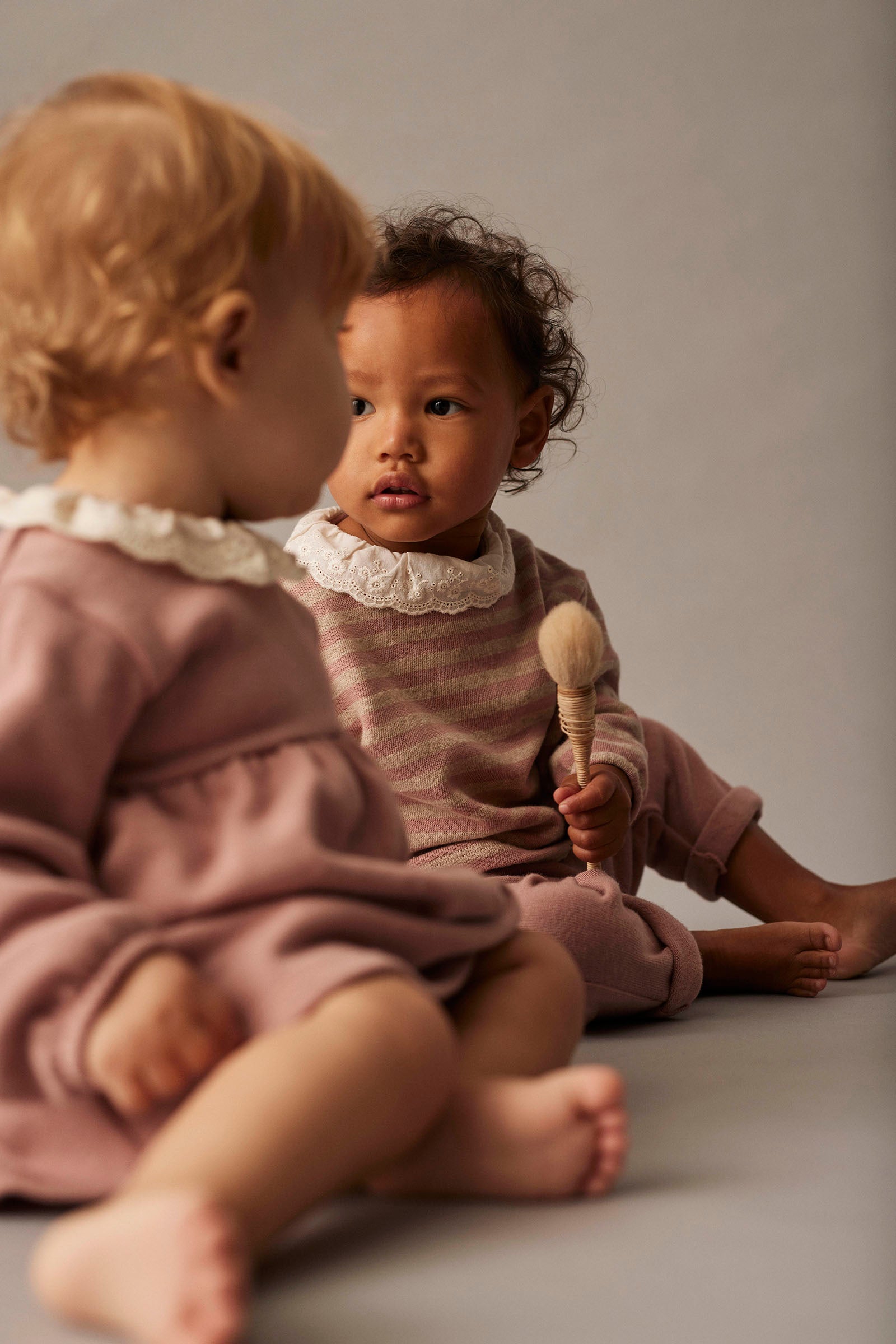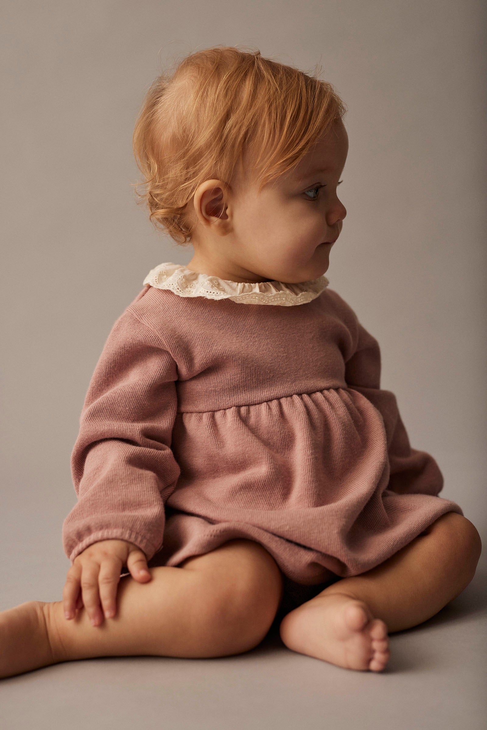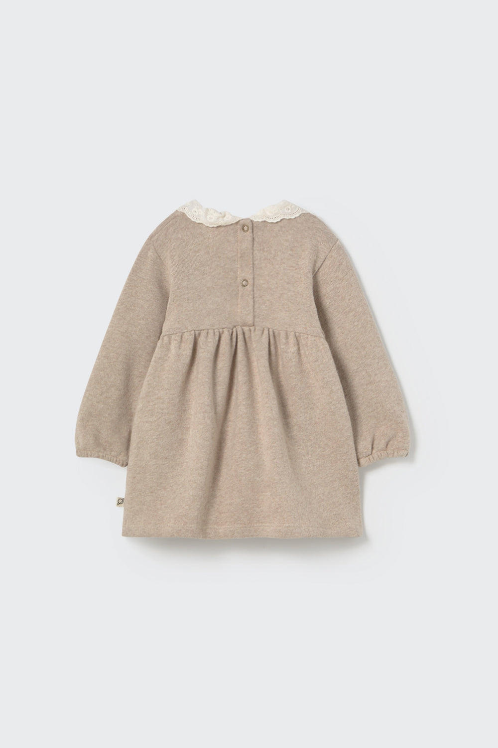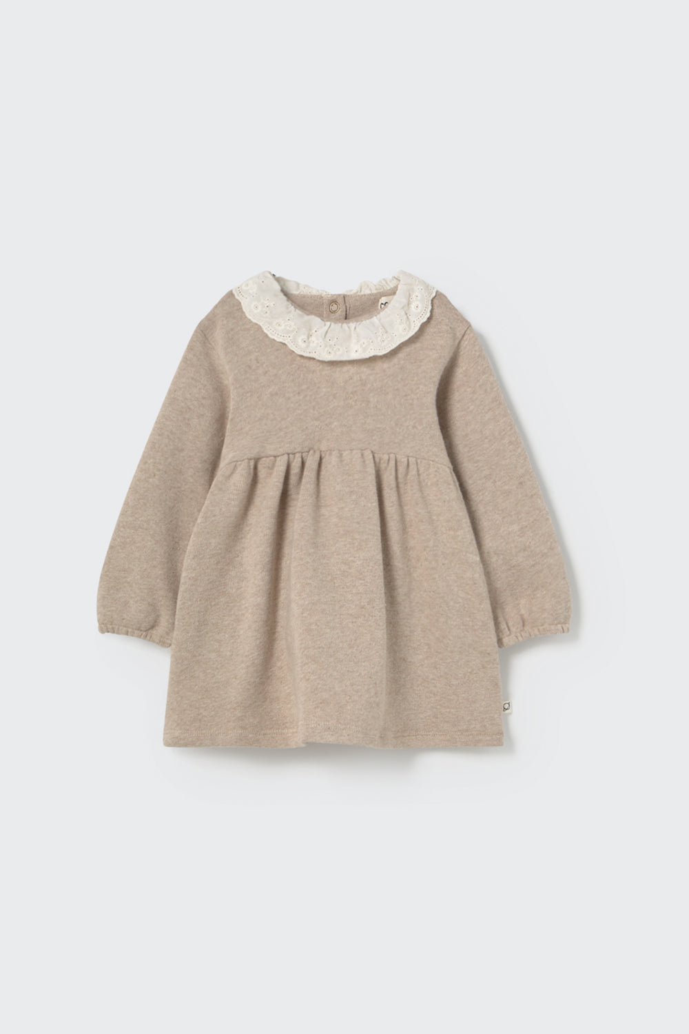 This baby dress is made from a buttery-soft knit, brushed inside and out for an extra warm finish. It features a frilled collar with delicate lace detailing and a button closure at the back for easy dressing. The front and back yoke add a classic touch, while long puffed sleeves with elastic cuffs offer comfort and gentle volume—perfect for keeping little ones cozy on cooler days.