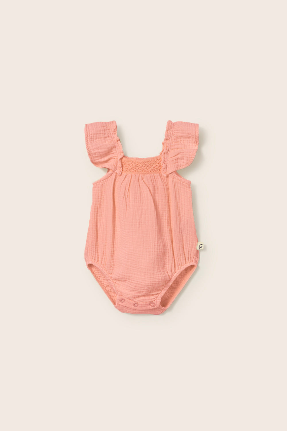 Baby and toddler girls’ gauze romper with a straight neckline. It features lace details at the upper section, flutter sleeves, elastic at the leg openings, straps, and back, and buttons at the gusset for easy dressing and a comfortable fit.
