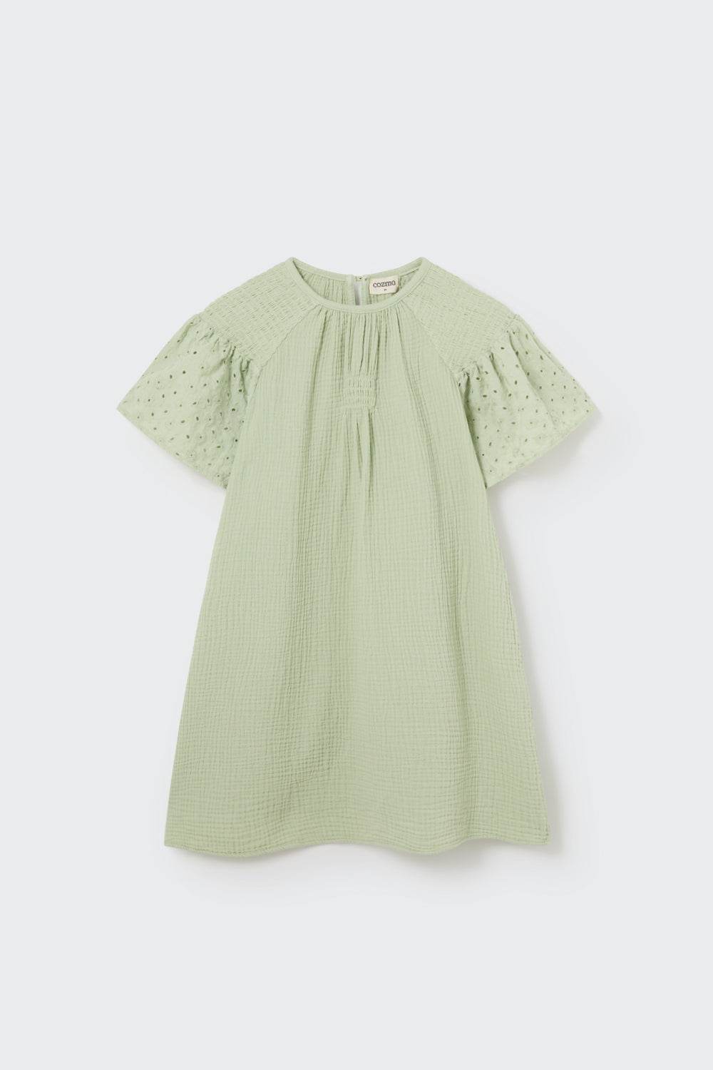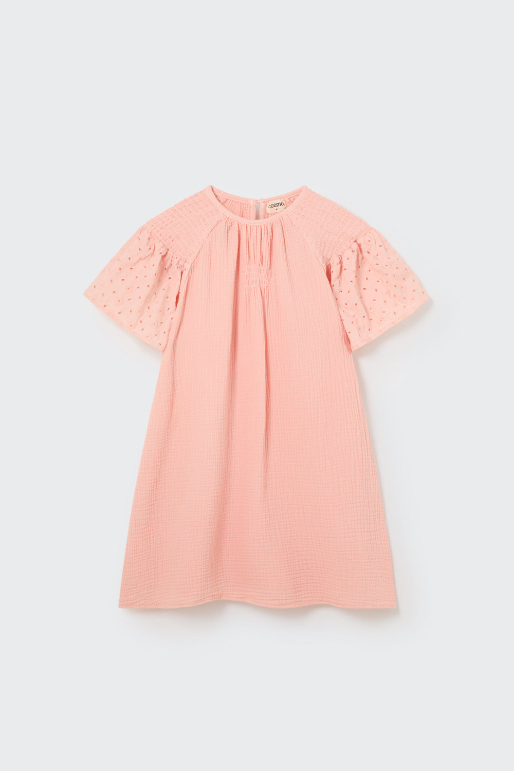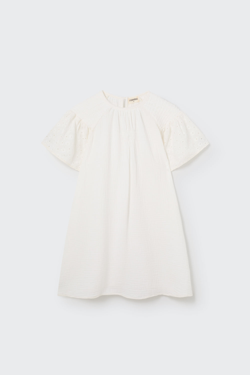 Dress in fluffy, light cotton gauze. Round neckline and a button teardrop closure at the back. Raglan smocked shoulders. Flutter sleeves with Swiss embroidery. Smocked details at the chest. Voluminous fit. Naturally wrinkled texture. Non-iron fabric.