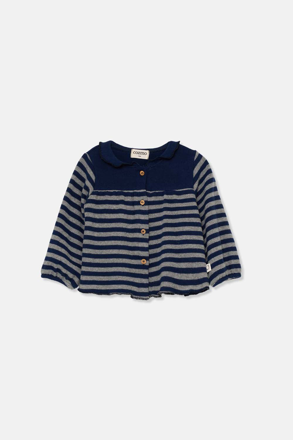 Flounced, ribbed collar and buttons at front. Long sleeves with elasticized cuffs. Gathered seam at upper section in a solid color. Overlocked edges at hem.