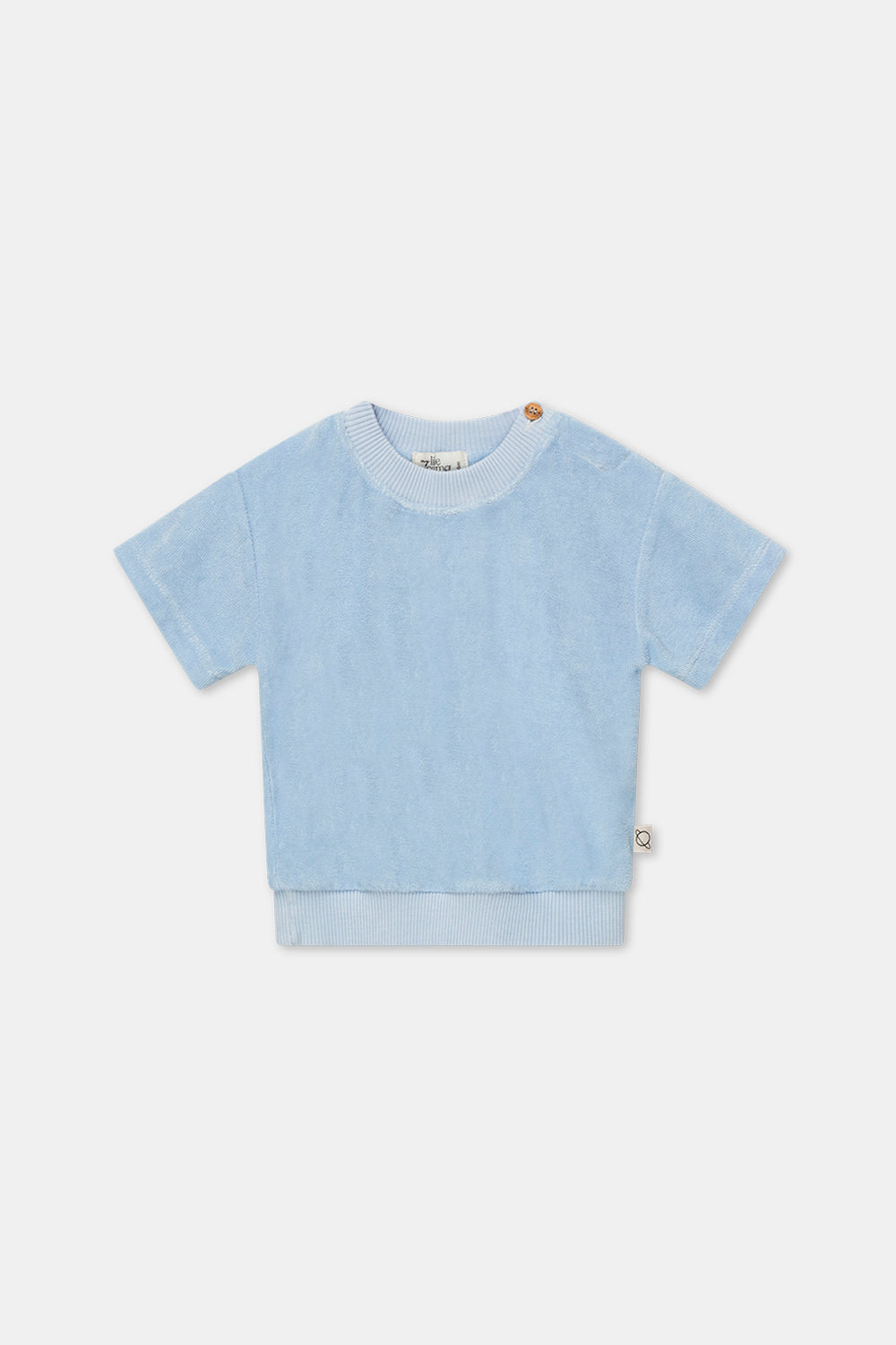Organic toweling T-shirt with button closure at the shoulder, and rib at the neck and hem.