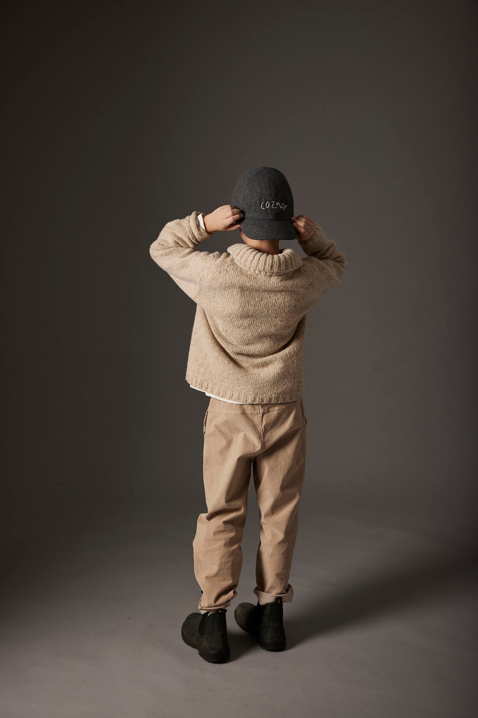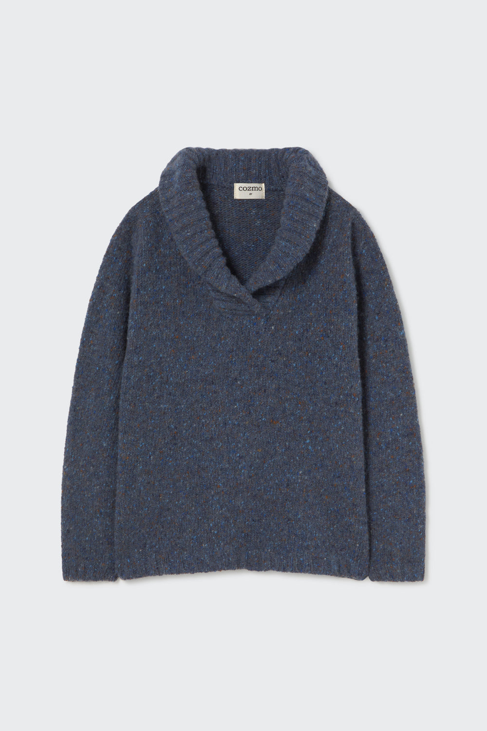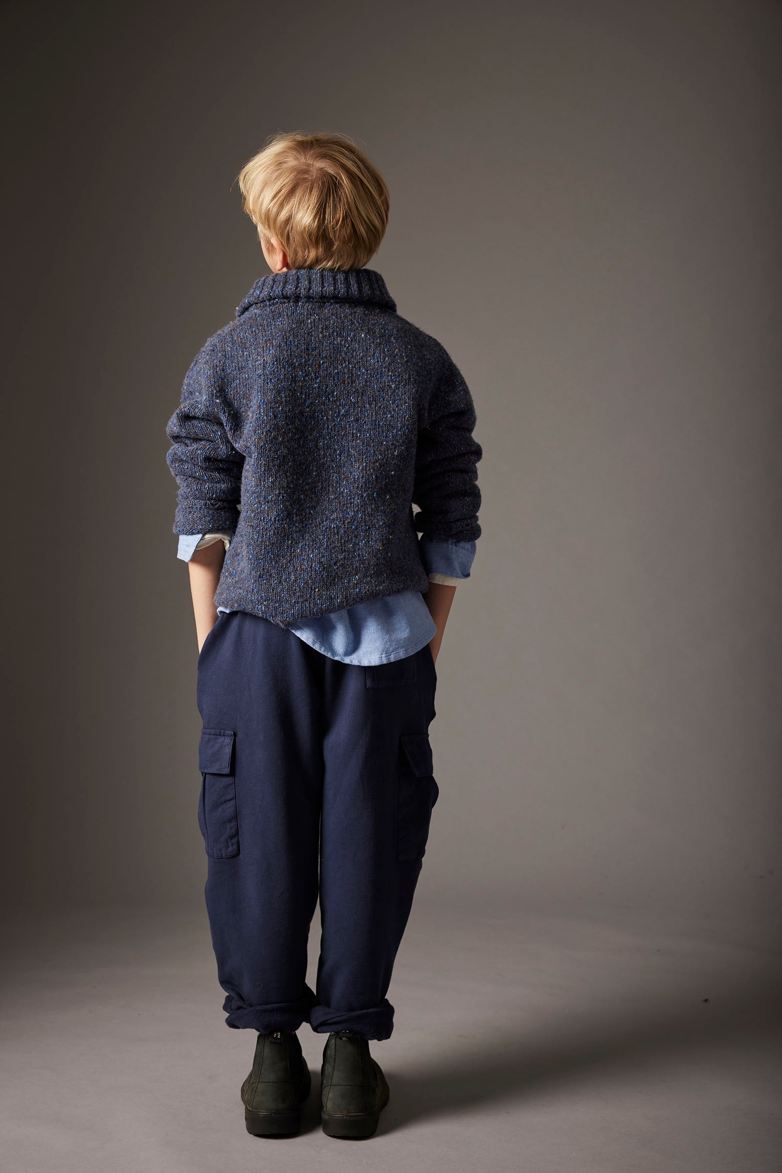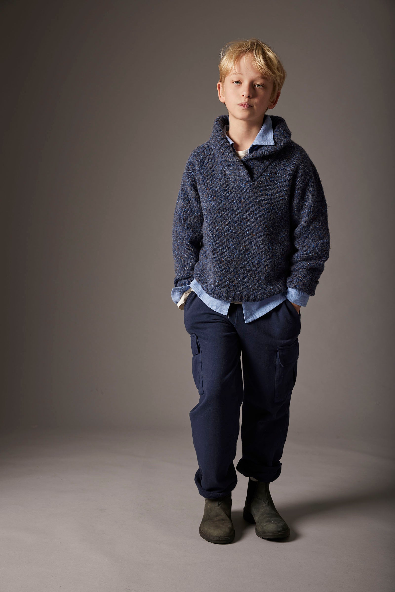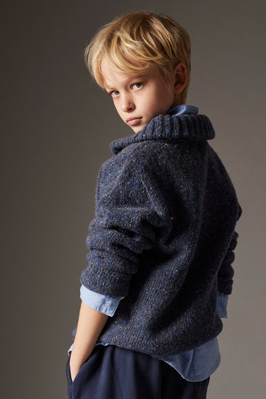 Boy’s sweater crafted from a soft, fluffy wool and recycled polyamide tricot blend. It features a cozy shawl collar and ribbed collar, cuffs, and hem. Subtly speckled for a gentle look. Part of our recycled kids clothes collection.