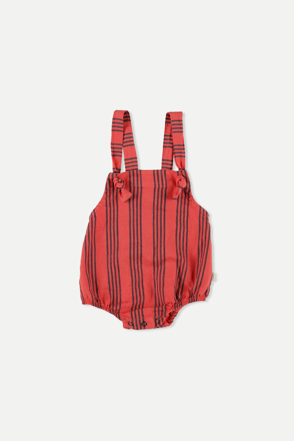 Overalls in smooth and lightweight cotton with printed stripes. Straight neckline and knotted straps. Elastic at back and leg openings. Snap buttons at gusset. Garment-dyed. 100% cotton. Woven