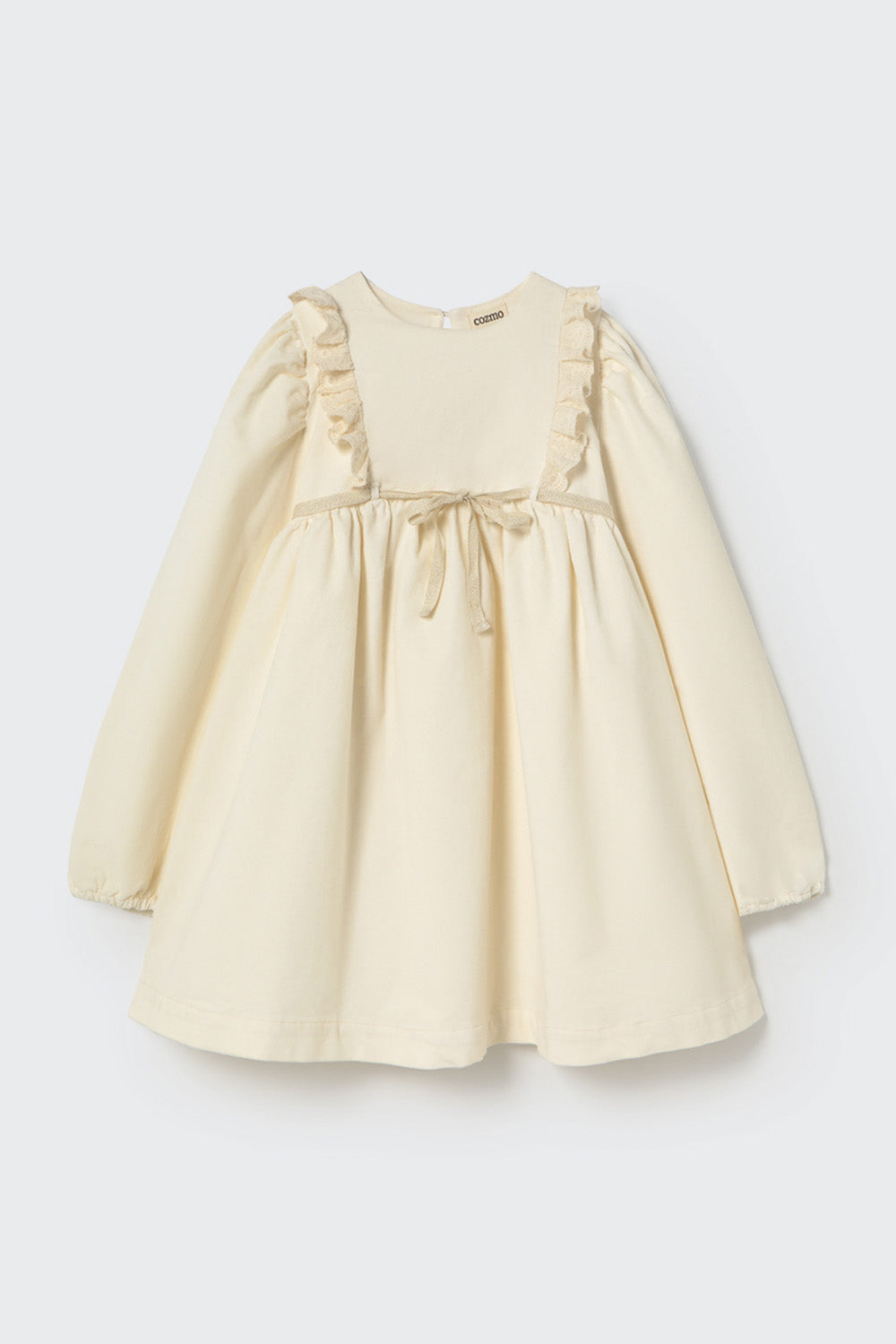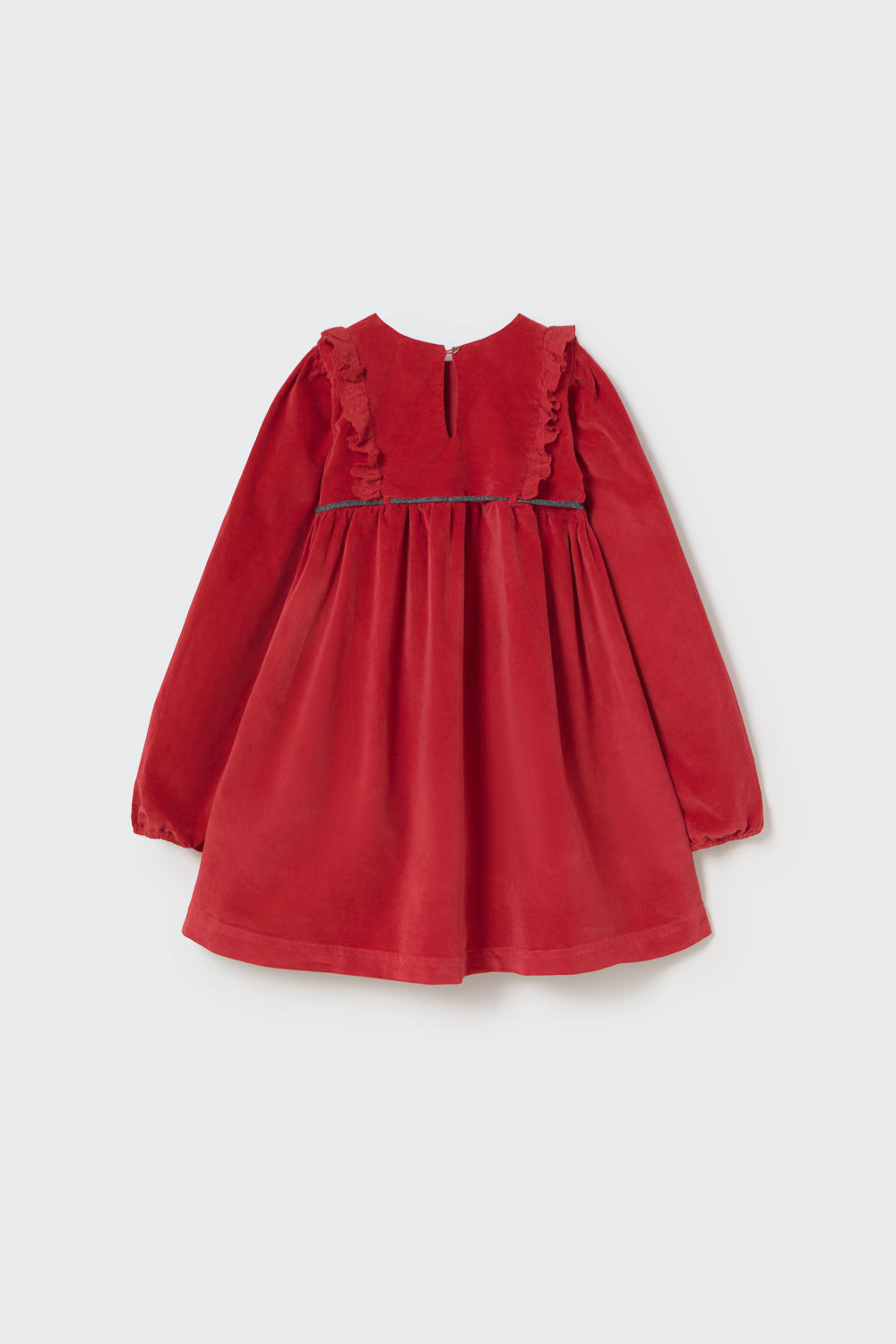 Dress made from stretchy sustainable cotton velour with a soft, velvety feel. It features a round neckline and front and back yokes with ruffles extending over the shoulders. Belt loops at the yoke seam hold a fixed herringbone tape belt. Long puffed sleeves with elasticized cuffs provide comfort. The back has a button-down closure with heart-shaped buttons. The bodice is lined with breathable cotton voile. Designed for girls.